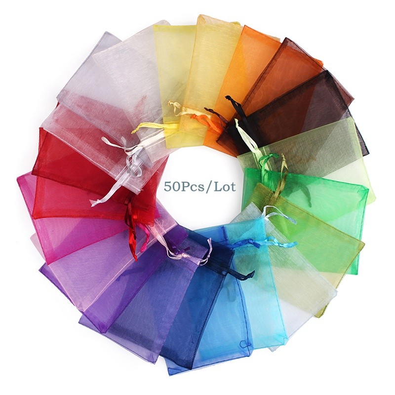 50 шт./лот 7x9 9x12 10x15 13x18 см сумки из органзы, сумка для ювелирных изделий, украшения для свадебвечерние сумки на шнурке подарочные мешочки, упаковка для ювелирных изделий
