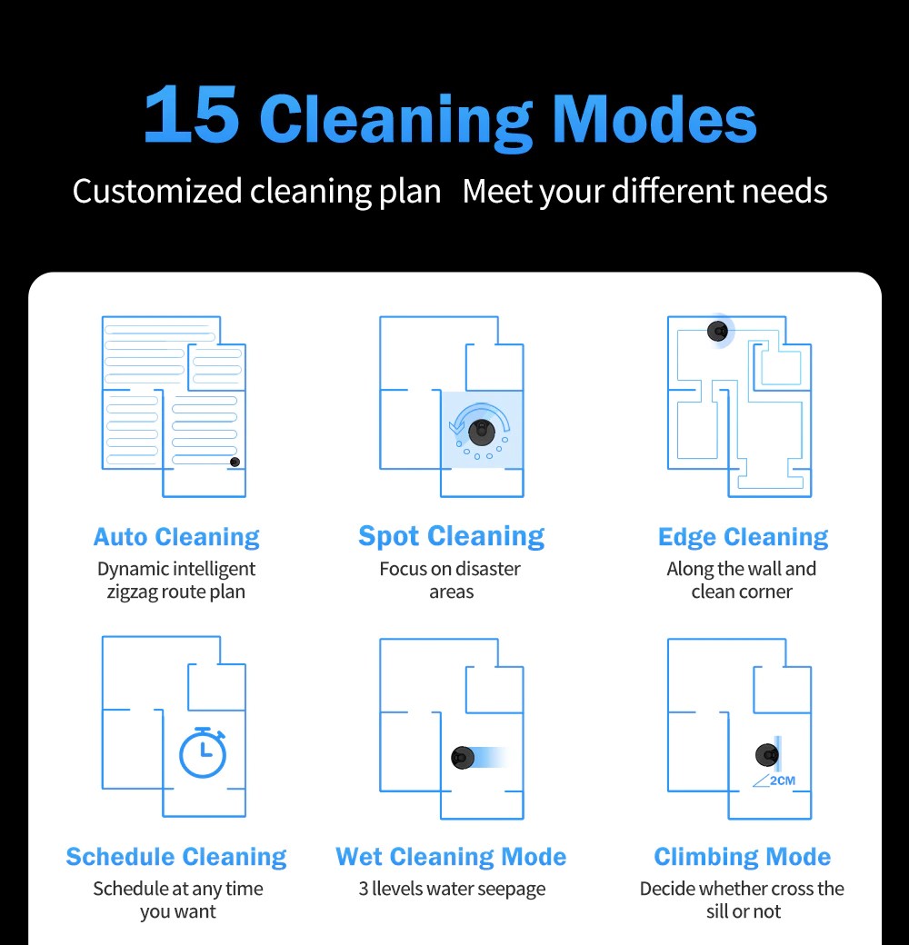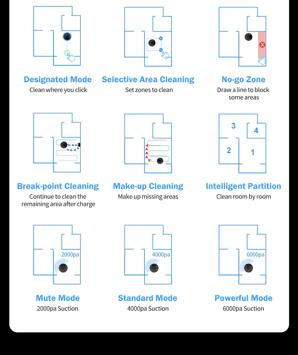 5. X6 имеет много мощных функций, начиная с тройной визуальной навигации. Вы можете указать X6 очистить определенное место на карте, вы можете выбрать, какую область вы хотите очистить на карте. Вы можете установить 4 виртуальных стены на карте. X6 также может возобновить очистку с точки, где произошла остановка, вы можете найти карту в приложении при следующей очистке. X6 работает более эффективно, чем другие роботы с навигацией по 2D-карте.