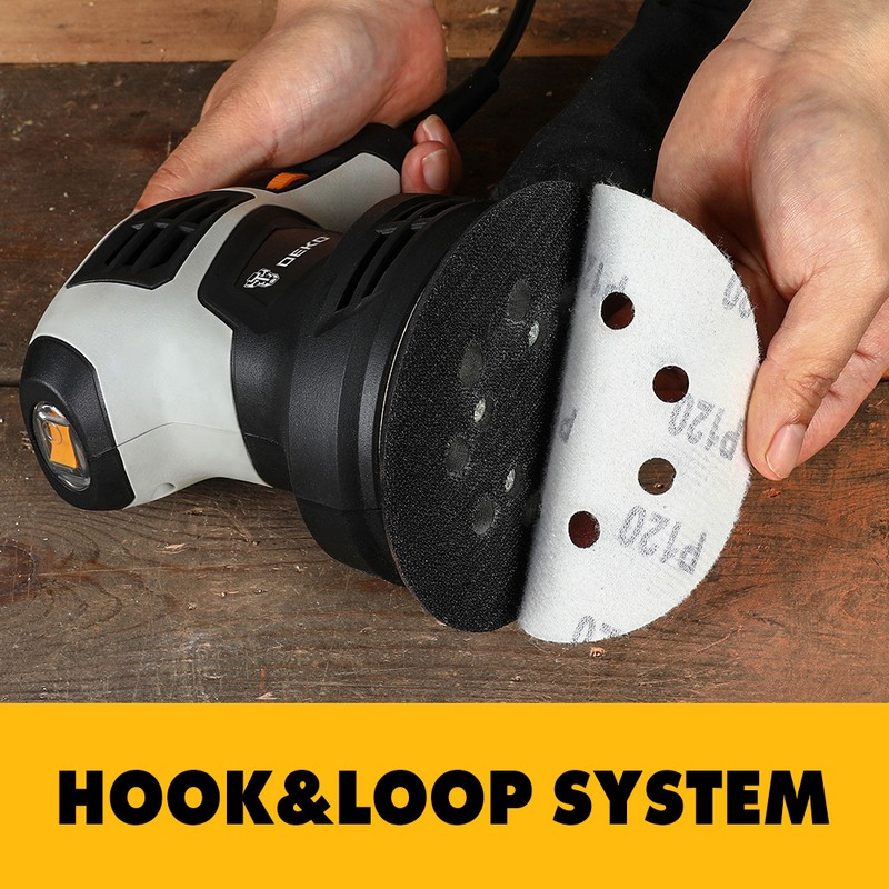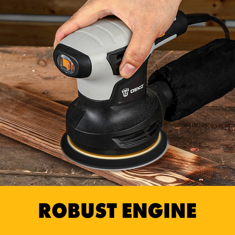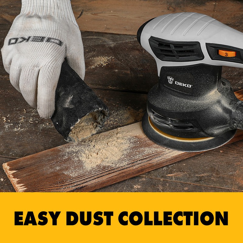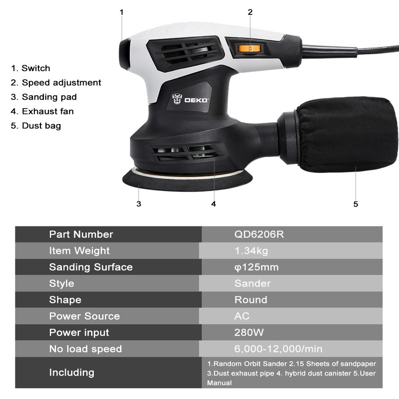 DEKO QD6206 280W случайная орбитальная шлифовальная машина приведение, которые любят все делать своими руками близко к рабочей поверхности, этот шлифовальный станок обеспечивает быструю зарядку, эффективное удаление отработанного материала с 3,0 Ампер энергетического 13000 количество вращений в минуту. Переключатель активируется путем естественного нажатия на ладонь руки, как будто шлифовальный станок используется. Этот инструмент предназначен для того, чтобы плотники и производители шкафов могли быстро выполнять свои задачи и соответствовать строгим стандартам, без вихревых знаков. Этот шлифовальный станок позволяет пользователям находить идеальную скорость для любой задачи, которую они должны выполнить, с оптимальной бортовой системой для фильтрации тонкой пыли.