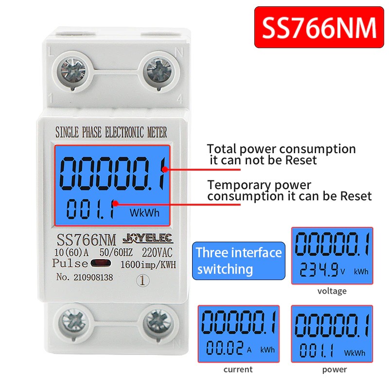 Счетчик-это многофункциональный дисплей, общая энергия кВт · ч, временная энергия кВт · ч, реальное напряжение, реальный ток, реальная мощность с помощью автоматического пропуска.