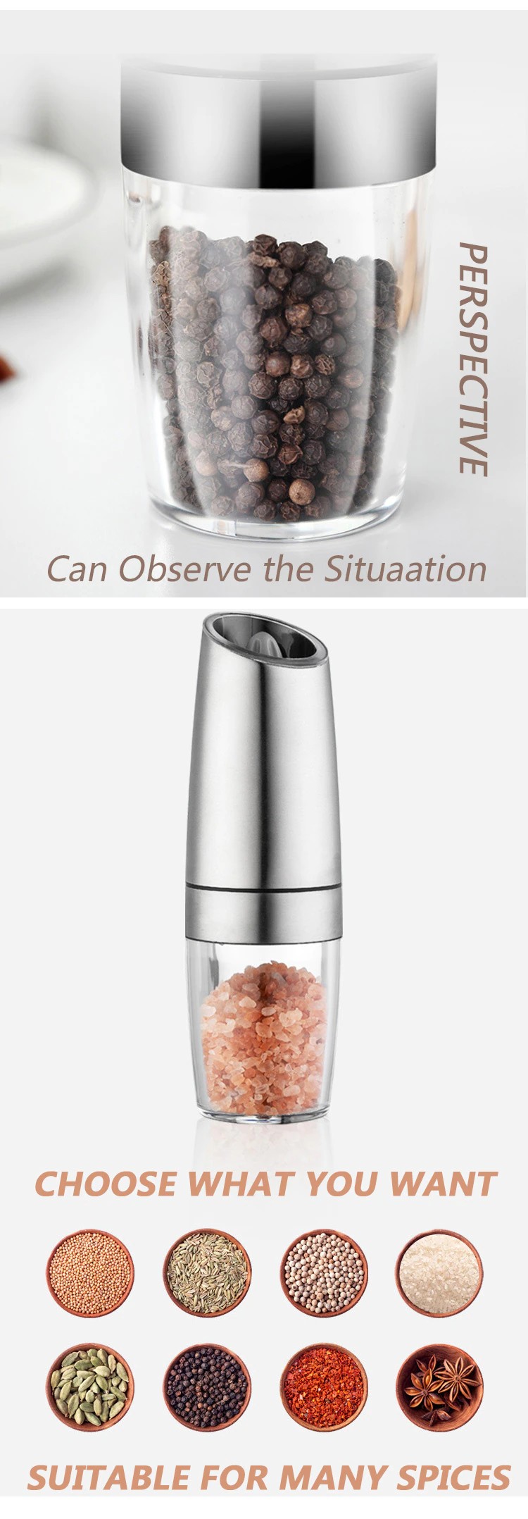 Позволяет пользователю менять тонкость или грубость измельчения, основываясь на требованиях к рецепту или личных предпочтениях. Автоматическая конструкция позволяет измельчать соль или перец одной рукой