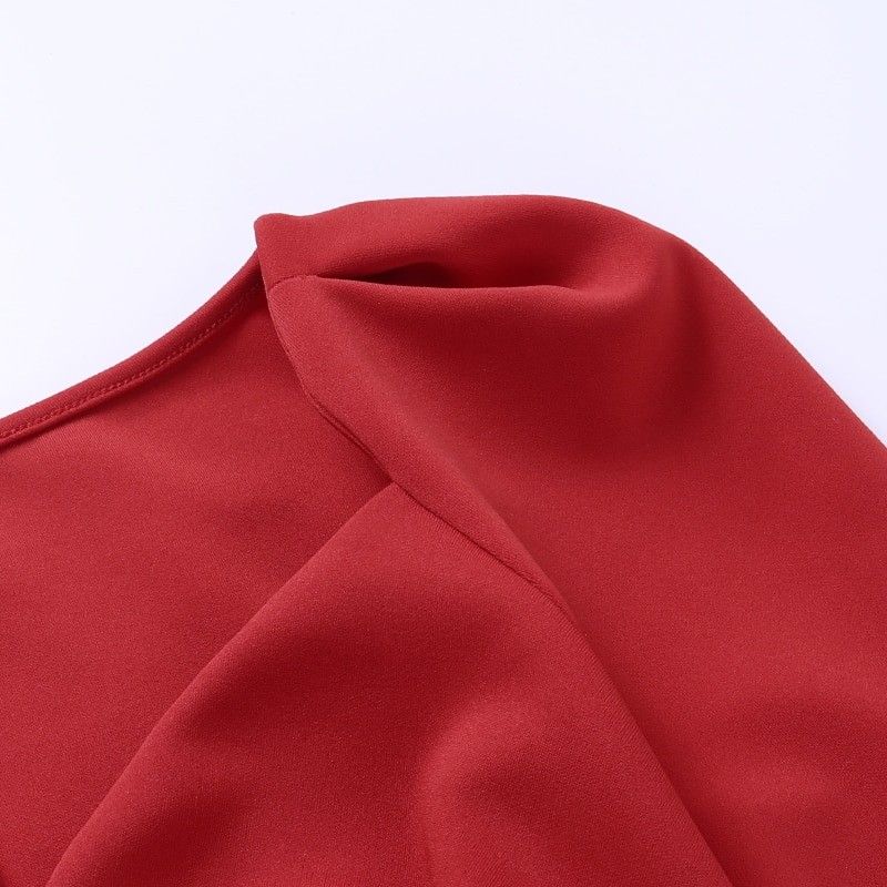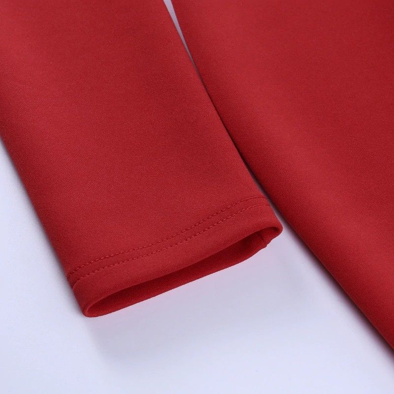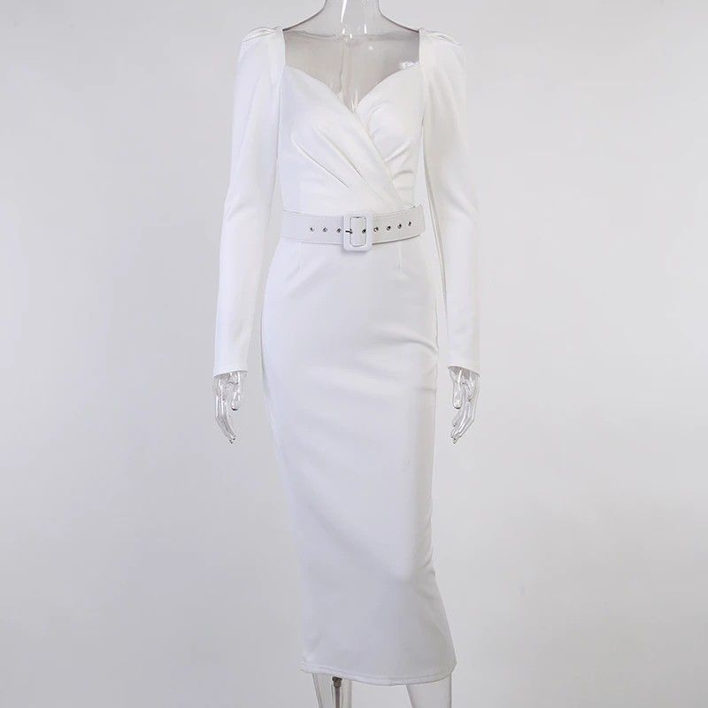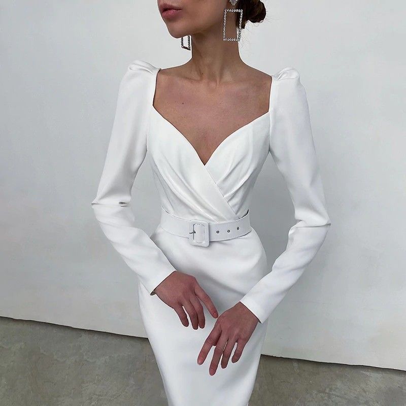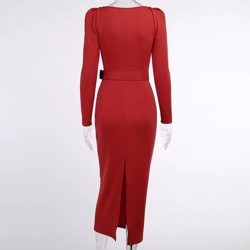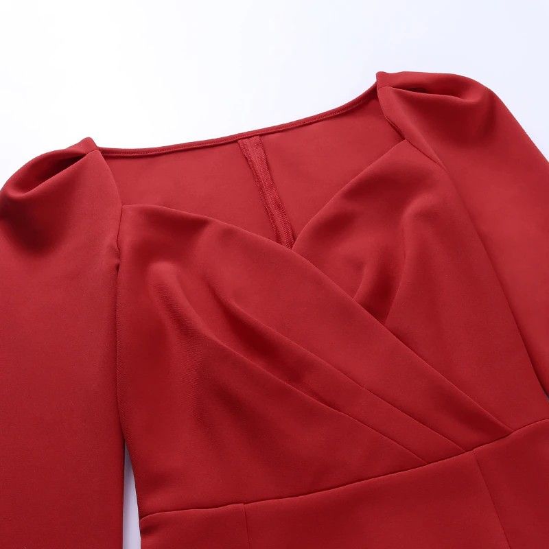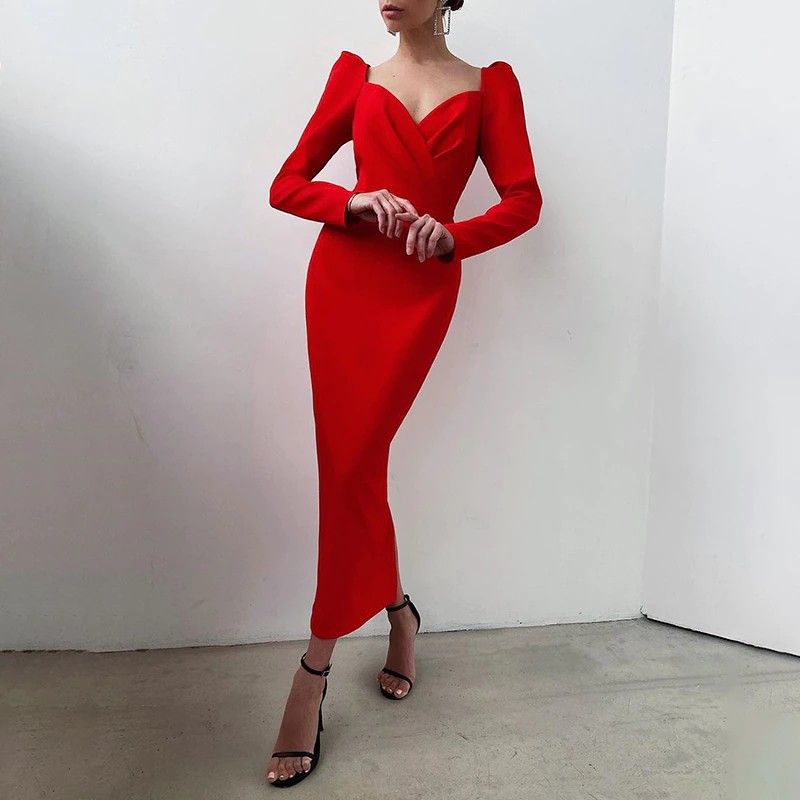 Instahot/Элегантные Вечерние Платья Для Женщин, Облегающее Платье-Карандаш До Середины Икры С V-Образным Вырезом И Длинным Рукавом, Повседневные Офисные Женские Однотонные Красные Платья С Пышными Рукавами Последний