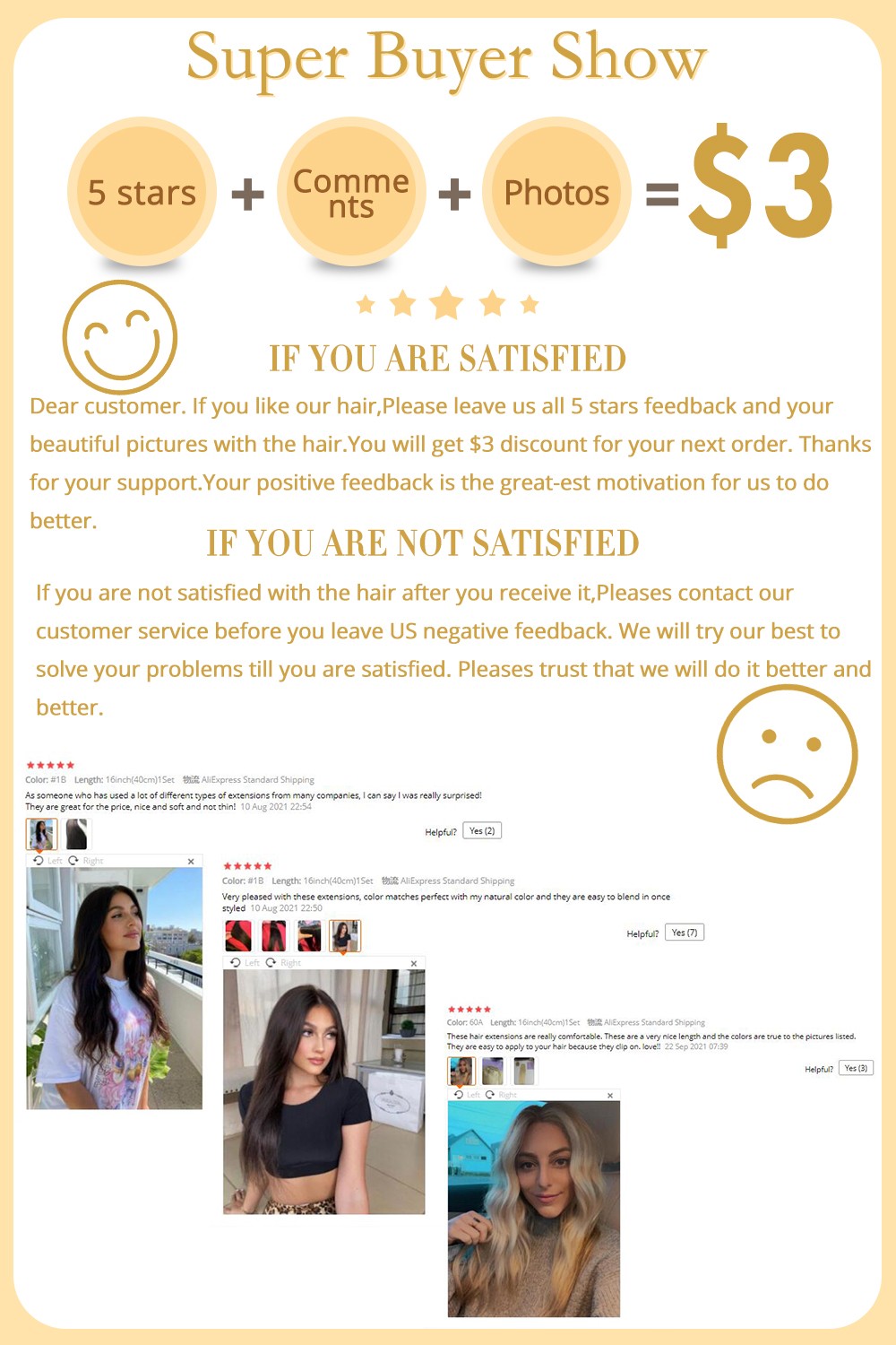 Уважаемый клиент. Если вам нравятся наши волосы, пожалуйста, оставьте нам все отзывы 5 звезд и ваши красивые фотографии с волосами. Вы получите скидку $3 для вашего следующего заказа. Спасибо за вашу поддержку. Ваши положительные отзывы-это отличная мотивация для нас, чтобы сделать лучше.