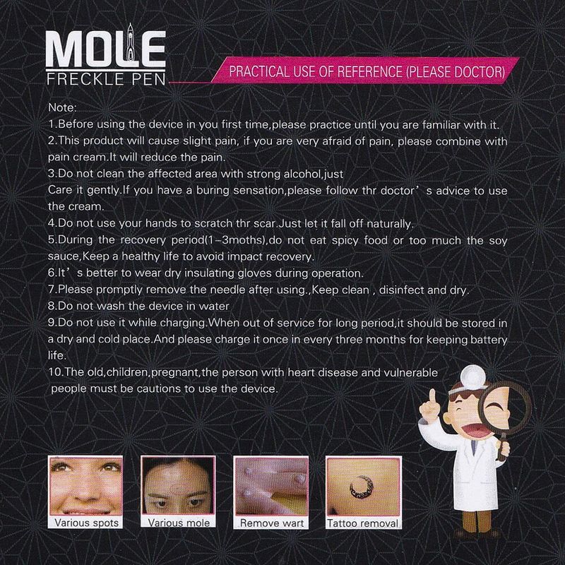 Посылка 1 ручка прибор для удаления родинок 30 ватных палочек 5 тонких игл 1 x грубые иглы 1 x крышка иглы 1 x USB-кабель для зарядки 1 x Руководство пользователя 1 x упаковочная коробка > 3 регулируемых уровня > Без ЖК-дисплея