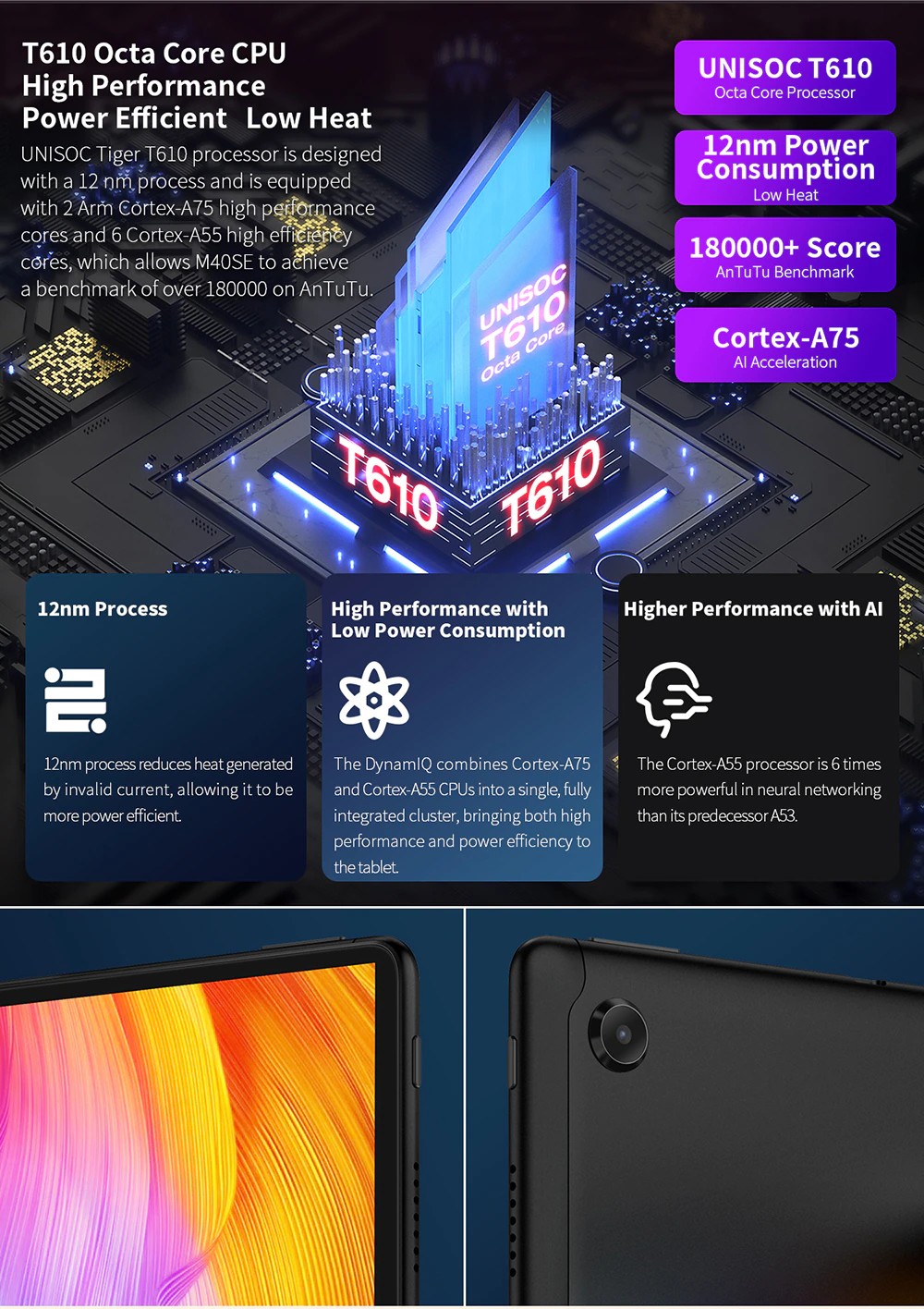 UNISOC T610 Восьмиядерный процессор | 12 нм энергопотребление Низкое тепло | 180000 + Оценка AnTuTu Benchmark | Cortex-A75 Ускорение AI |