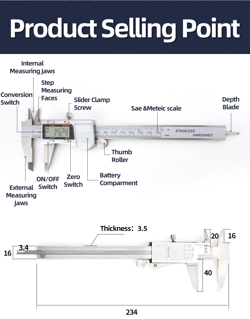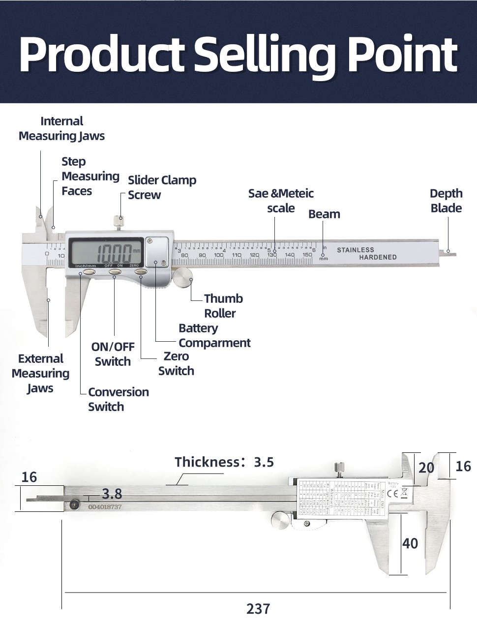 Характеристики: оснащен 40cr1 3 когтями из нержавеющей стали и пластиковой оболочкой из АБС-пластика. Этот экран штангенциркуля очень большой, и цифровой дисплей очень четкий.