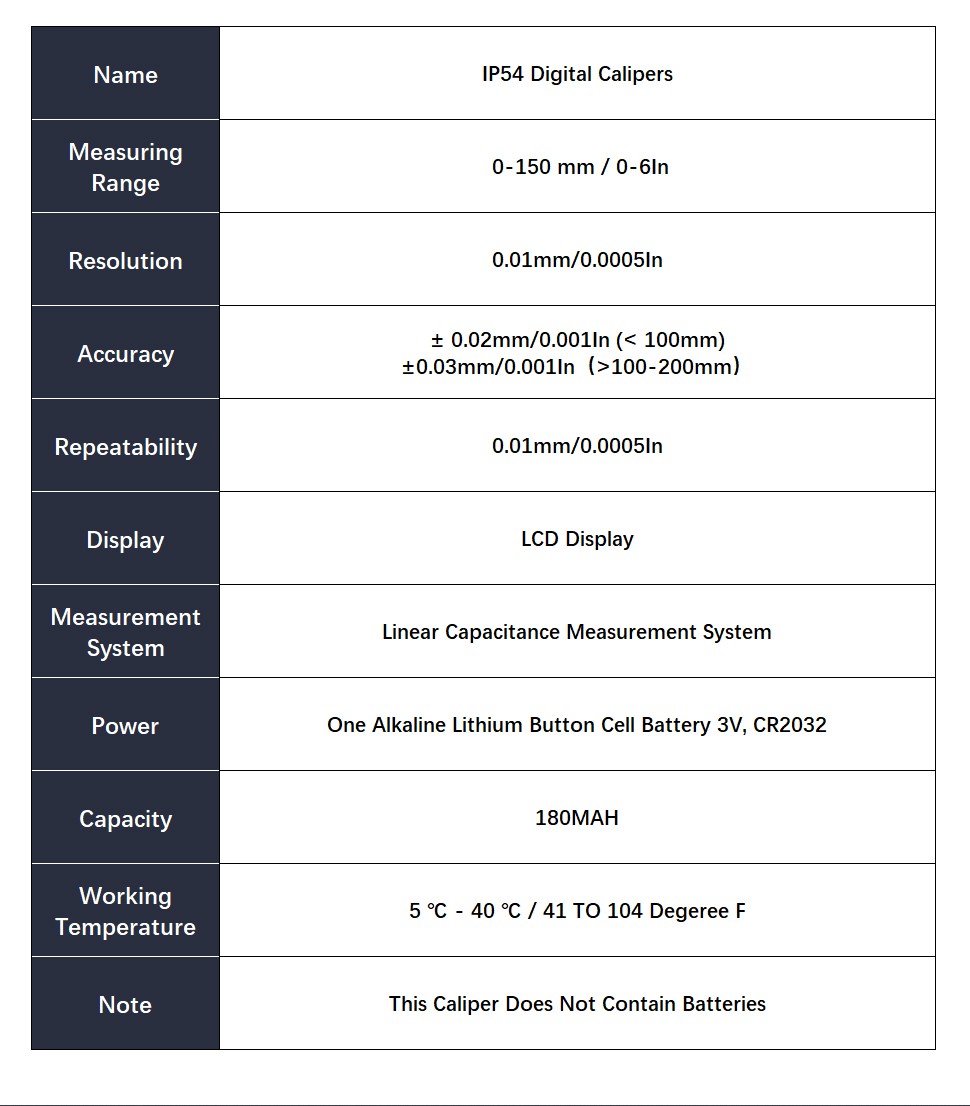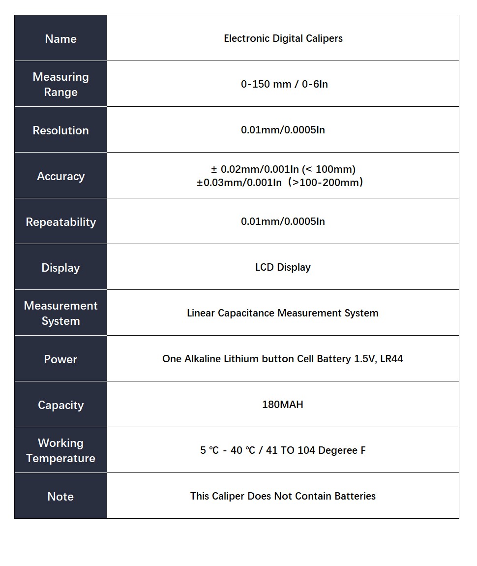 2. Штангенциркули поставляются без батарей, пожалуйста, приобретайте их самостоятельно.