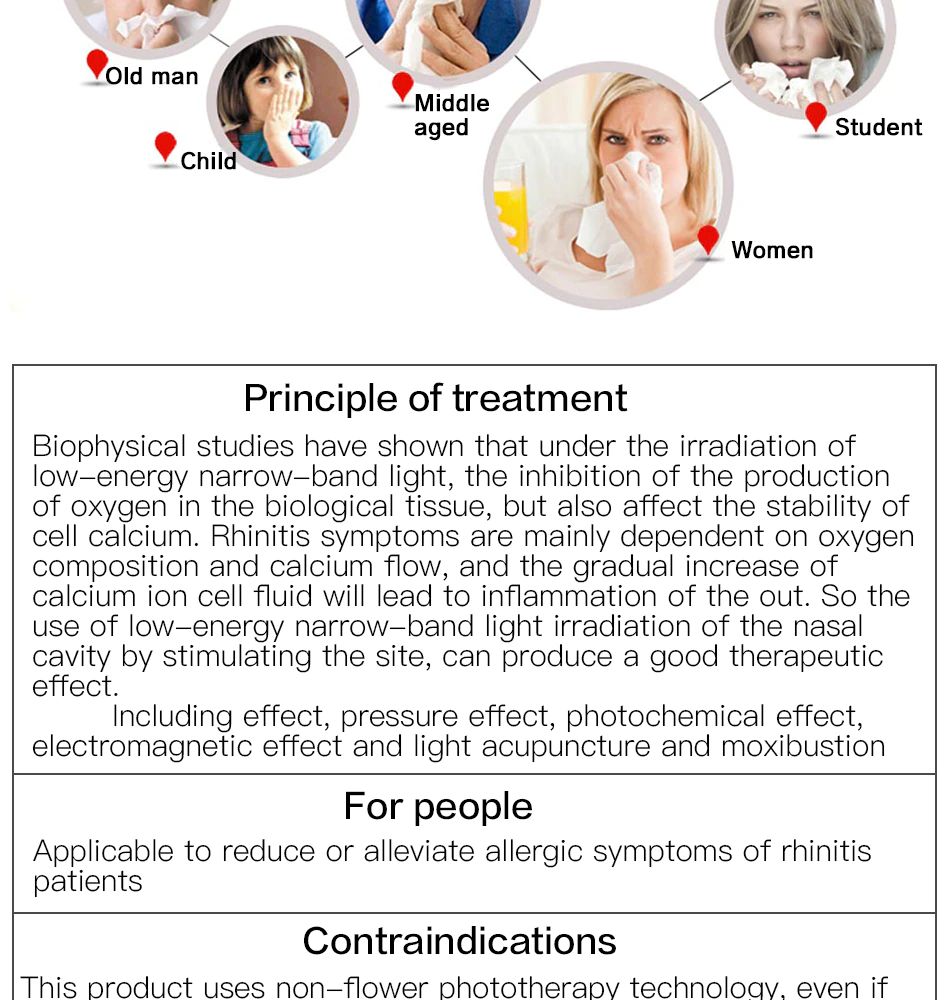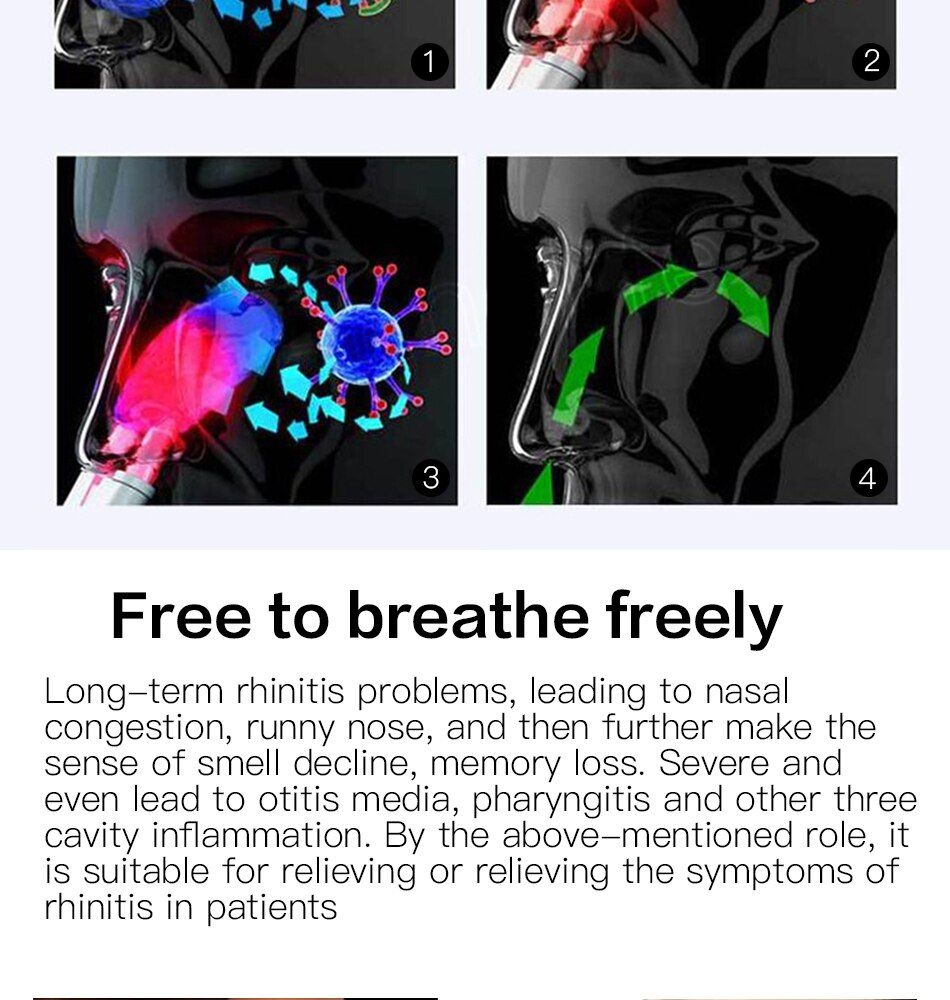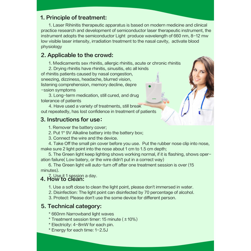 Прибор фототерапии ринита непосредственно облучает повреждения носовой полости низкоэнергетическим узкочастотным холодным лазером с длиной волны 660 нм. 660 нм Низкоэнергетический узкочастотный холодный лазер-это текущий спектр/узкий, проникающий лазер. Его применение было также в аэрокосмической технологии. Поля, такие как космическая Капсульная резка, астронавт заживление ран и т. д., 660 нм Низкоэнергетический узкочастотный холодный лазер может проникать в подкожную ткань 5 мм, обеспечить энергию, необходимую клеткам, И глубоко активирует тканевую активность повреждения, до тех пор, пока тканевая активность повреждения восстанавливается, Носа строго зажила!