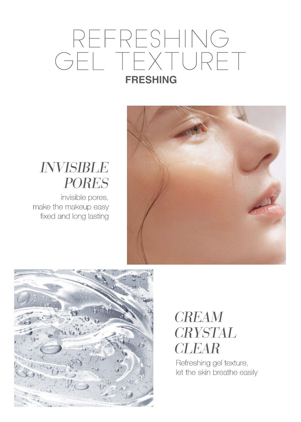 (3) Способ применения: Добавьте две щеки в верх, низ и низ. Нажмите на пять точек и откройте или расправьте их. Это занимает немного времени, чтобы впитать, потому что это гель. Ваше лицо будет очень гладким и освежающим после впитывания. Наконец Нанесите тональный крем. Тогда ваш макияж будет более естественным матовым и не какиевым.