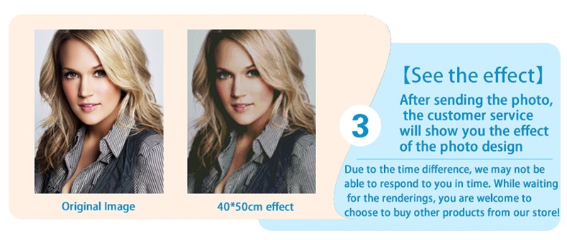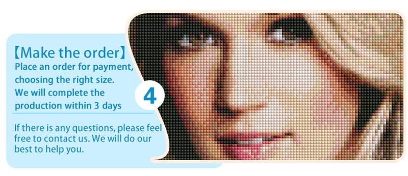 1. 【Выберите фотографию 】 Выберите свою любимую фотографию в альбоме телефона. 2. 【Отправьте фото 】 свяжитесь с нами, отправьте нам выбранную вами картинку и сообщите нам размер. 3. 【Посмотрите на эффективность 】после отправки фотографии, служба поддержки клиентов покажет вам эффект фото дизайна. 4. 【Сделайте заказ 】 разместите заказ для оплаты, выбрав правильный размер. Мы завершим производство в течение 3 дней.