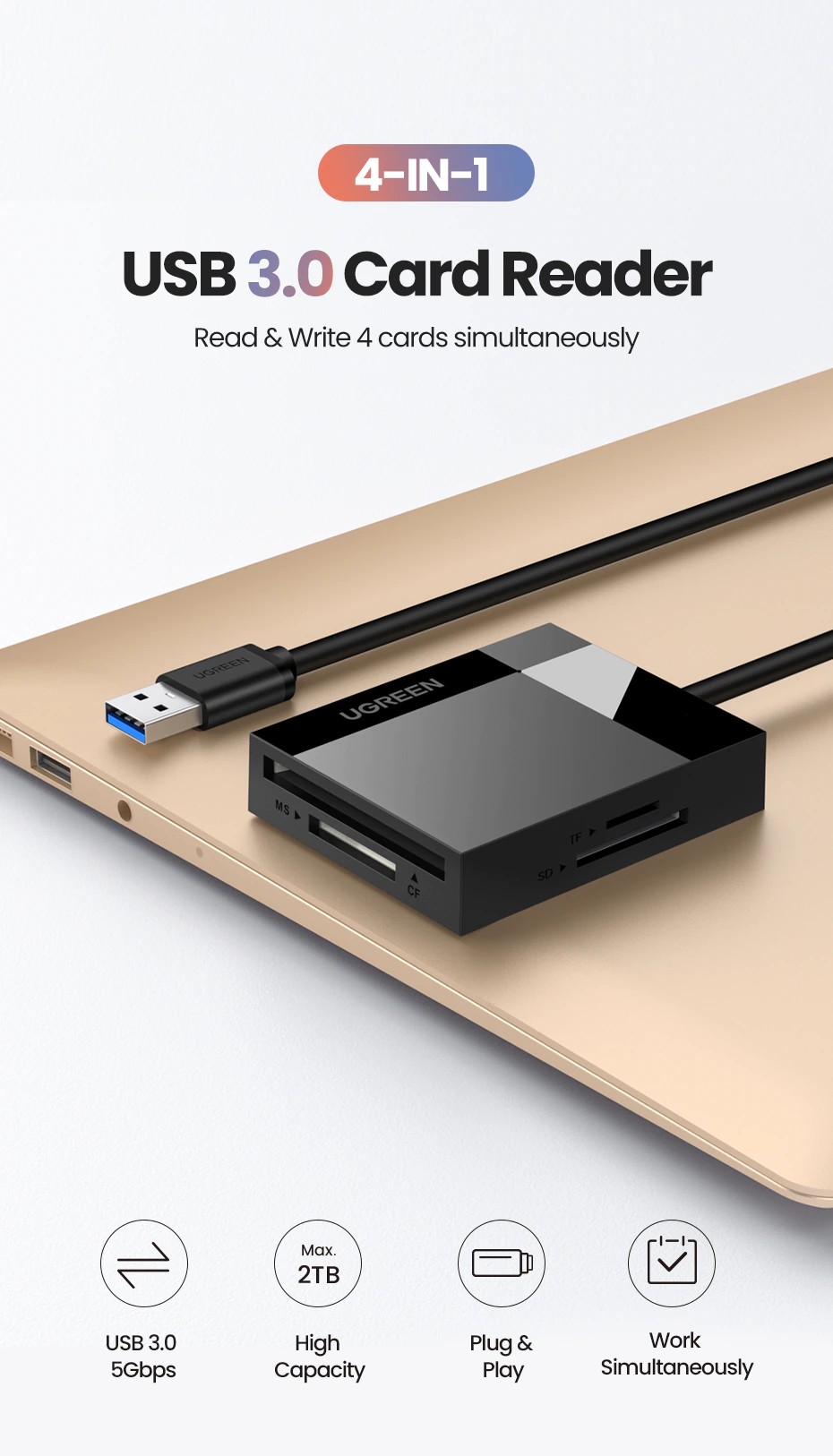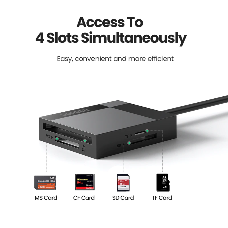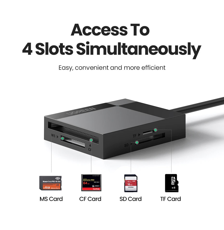 В отличие от других адаптеров для карт с одним считыванием, устройство считывания карт Ugreen позволяет одновременно считывать 4 карты и позволяет вам отвлекаться от проблем с постоянным отключением и повторным подключением.