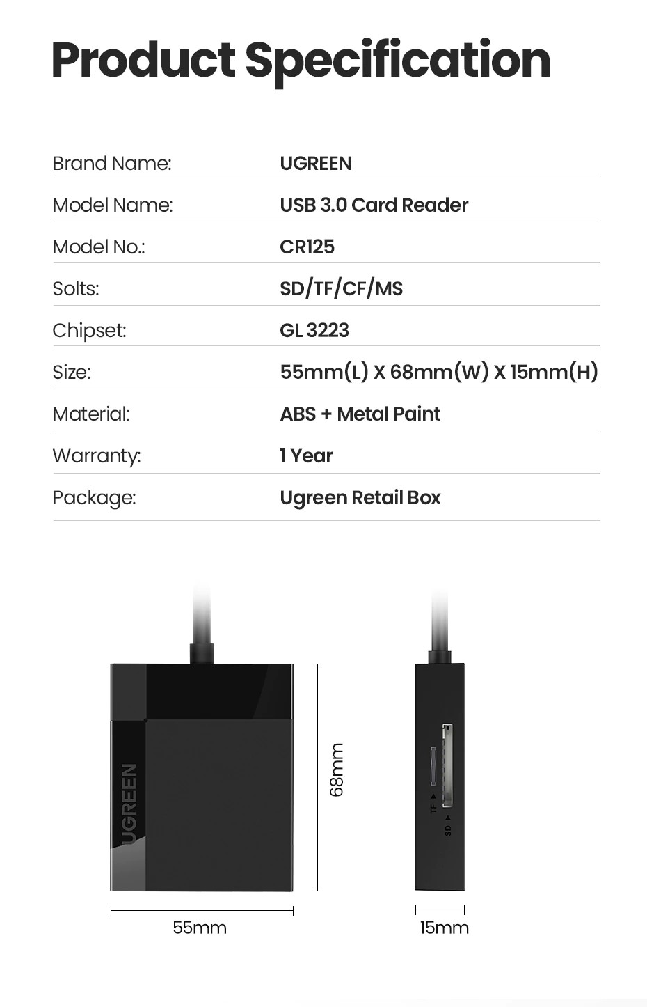 UGREEN кард-ридер USB3.0 для SD карты Micro SD/TF/CF/MS Картридер для портативных ПК для чтения смарт-карт SD кард-ридер карт 4 в 1 адаптер