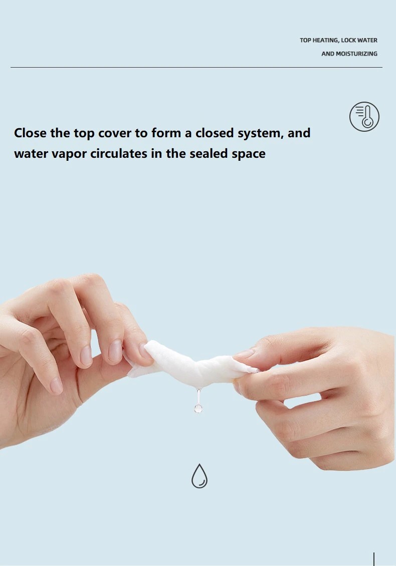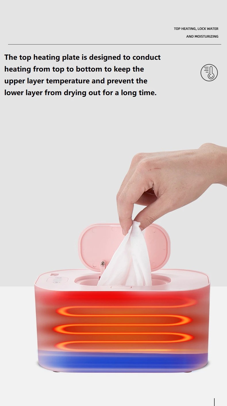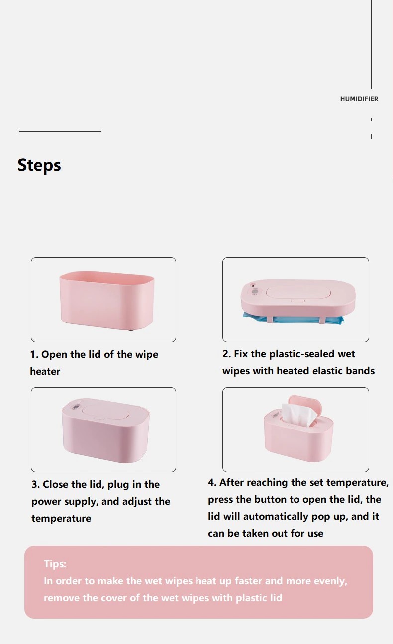 Для того, чтобы влажные салфетки нагревались быстрее и равномернее, снимите крышку влажных салфеток пластиковой крышкой