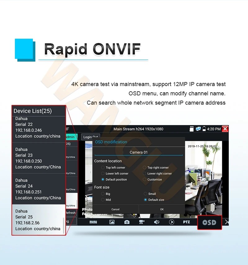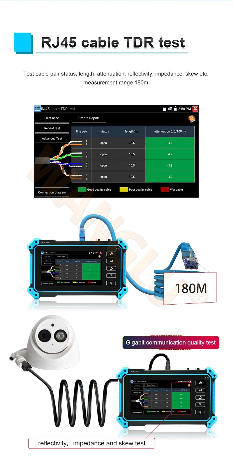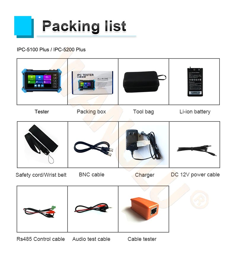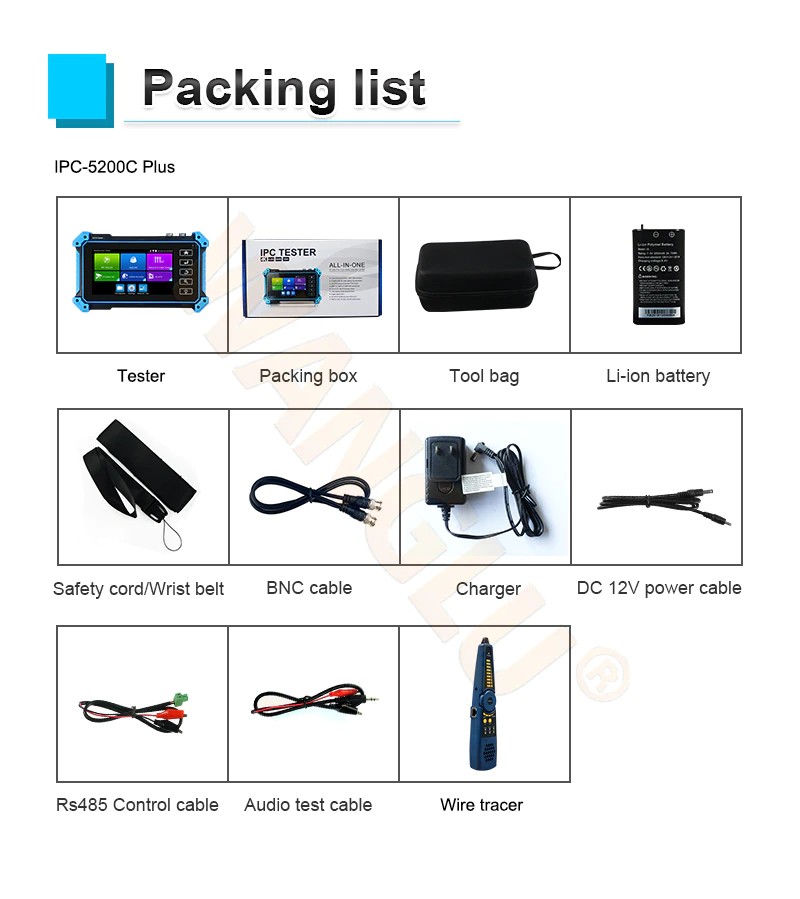 Новейший тестер 5 дюймов 4K IP CVI TVI AHD SDI все в одном VGA и 4K HD ВХОД IP-камеры Модель: IPC-5200 плюс ● 5-дюймовый сенсорный экран IPS, разрешение 1920x1080 ● Тест камеры 8MP CVI/ TVI/ AHD ● Тест камеры 8MP EX-SDI, HD-SDI, 3G-SDI ● H.265/H.264, 4K видео дисплей через основной ● Вход VGA, поддержка 1920x1200 60 кадров в секунду ● Вход HD, поддержка 4K 30 кадров в секунду ● Выходная мощность PoE 12 в пост. Тока 3 А, 48 В ● Автоматическое HD, автоматическое распознавание типа и разрешения коаксиальной HD-камеры ● Тестирование кабеля RJ45 TDR, открытие кабеля, испытание шорт и длины, макс. 180 м. ● Тестирование кабеля UTP, обнаружение конечного, среднего и дальнего отказа кабеля rj45. Тест камеры: ● 5-дюймовый сенсорный экран IPS, разрешение 1920*1080 ● H.265 & H .264 IP, 4K видео дисплей через основной ● Аналоговый Тест камеры, контроллер PTZ ● 8-мегапиксельное тестирование TVI, 3840x2160P 12,5/15 FPS, 4xzoom, запись и воспроизведение видео, коаксиальное Управление PTZ и меню экранного меню ● 8MP AHD тест, 3840x2160P 15 FPS, 4xzoom, запись видео и воспроизведение, коаксиальный PTZ и меню экранного меню вызова ● Тест CVI 8MP, 3840x2160P 12,5/15FPS, 4xzoom, запись и воспроизведение видео, коаксиальный PTZ и меню экранного меню ● 8MP EX-SDI тест, 3840x2160P 25/30FPS,4xzoom, запись видео и воспроизведение, коаксиальный PTZ и меню экранного меню ● HD-SDI тест, 1920x1080P 25/30/50/60 FPS, 4xzoom, запись и воспроизведение видео, коаксиальный PTZ и меню экранного меню ● Тест 3G-SDI, 1920x1080P 50/60 FPS, 4xzoom, запись видео и воспроизведение, коаксиальный меню PTZ и экранного меню вызовов ● Автоматическое HD-приложение, автоматическое распознавание типа и разрешения HD коаксиальной камеры, поддержка моментальных снимков, записи и воспроизведения видео, коаксиальное меню PTZ и call OSD ● Вход VGA, до 1920x1200 60 кадров в секунду, поддержка моментальных снимков, видеозаписи и воспроизведения ● Вход HD, до 4K 30 кадров в секунду, поддержка моментальных снимков, видеозаписи и воспроизведения ● Быстрый ONVIF, автоматический вход и отображение изображения, создание отчета о тестировании ● IPC test pro, автоматическое сканирование всех сетевых сегментов IP, автоматическое открытие питания PoE и отображение питания. Введите имя пользователя и пароль, можно сканировать Изображение камеры, можно пакетную активацию камер. Переход к интерфейсу ONVIF и инструментам тестирования. ● Проверка камеры, введите приложение ONVIF, введите имя пользователя и пароль для тестирования ● Одновременное IP-и аналоговое отображение изображения ● Тест IPC (тест без ONVIF) ● Выходная мощность 12 в пост. Тока/3 А, питание камеры от напряжения 12 в пост. Тока ● Быстрое видео, всего одним нажатием кнопки для обнаружения всех сетевых камер и автоматического отображения ● Встроенный Wi-Fi, отображение изображения с беспроводной камеры, создание точки доступа Wi-Fi Тест кабеля: ● Тестер кабеля для улучшения, кабель UTP, телефонный кабель и т. д. тестирование заказа и подключения, может сохранить отчет о тестировании, если специальный номер, требуется индивидуальный заказ. Может определять точку отказа ближнего, среднего и дальнего конца кабеля rj45. ● Тестирование кабеля RJ45 TDR, состояние пары тестовых кабелей, длина, затухание, отражательная способность, импеданс, перекос и т. д., возможность создания отчета об испытаниях ● Цифровой кабельный трассировщик, поисковый BNC кабель, сетевой кабель и телефонный кабель от беспорядка кабелей. Поиск кабеля и кабель UTP могут протестироваться одновременно *(Дополните