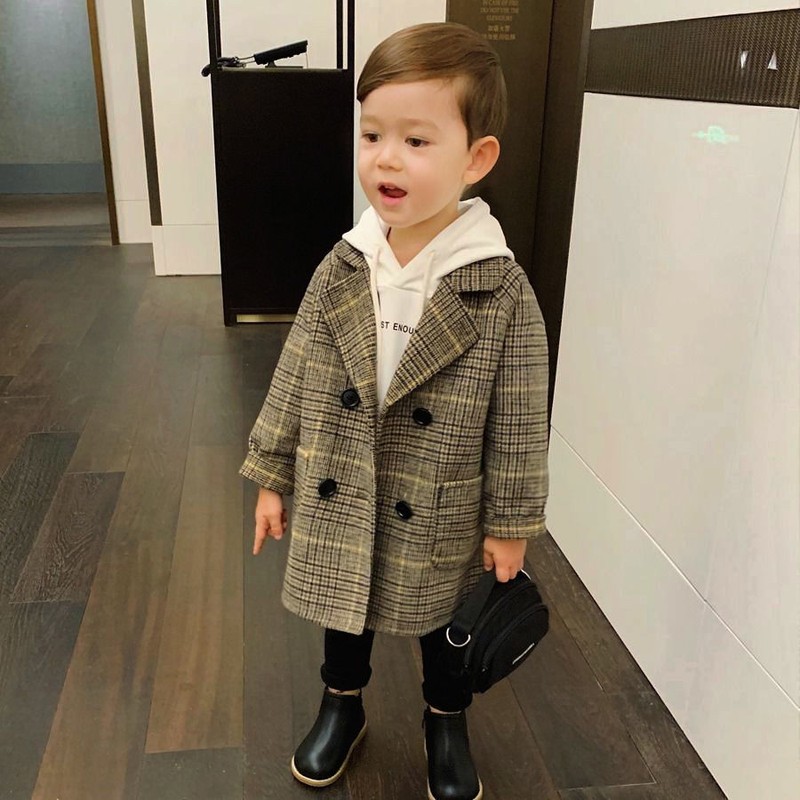 Зимние куртки в клетку двубортный шерстяной плащ для маленьких мальчиков и девочек детская верхняя одежда с лацканами, пальто шерстяное пальто зимнее пальто