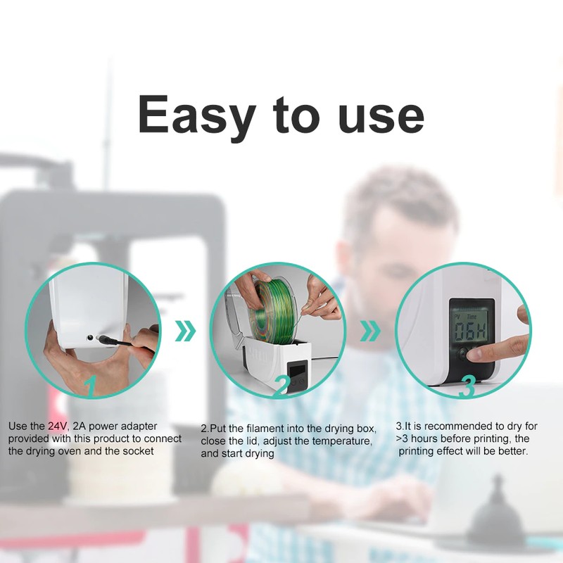 A. Add and subtract temperature: Users can adjust the temperature of the drying box according to factors such as the material of the consumables, the ambient temperature, and the humidity. It is recommended to bake for more than 3 hours, and then