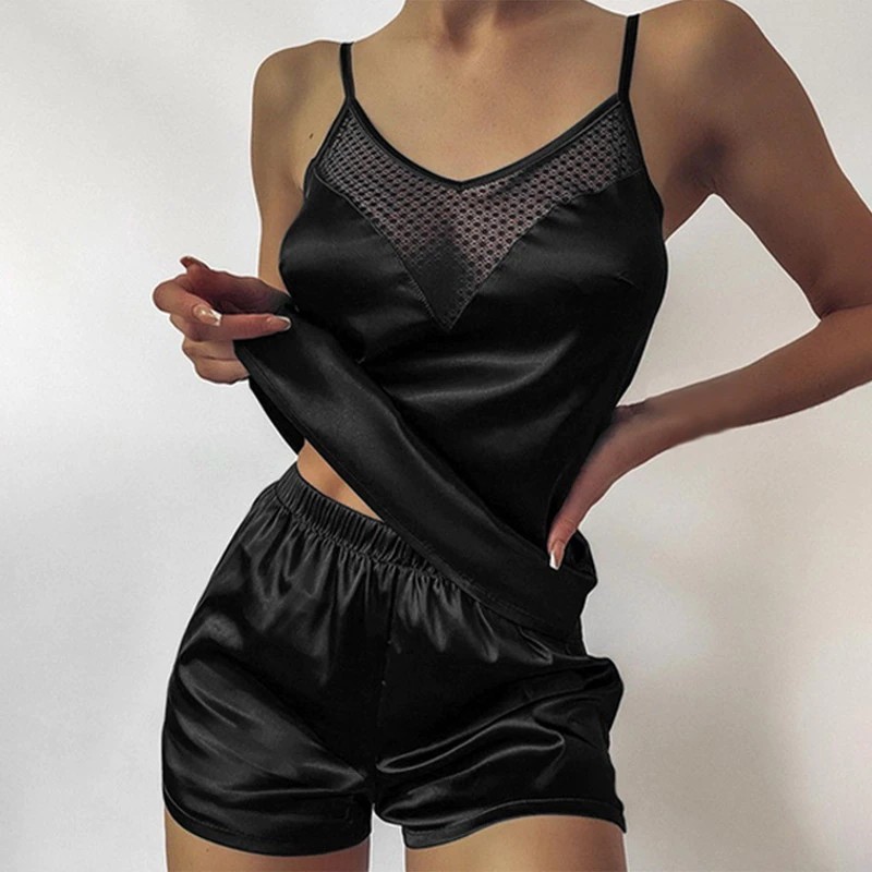2 Adet Moda Kadınlar V Yaka Streç Saten Babydoll Dantel Seksi Iç Çamaşırı Ilmek Pijama Uyku Şort Takımı Pijama Takım Elbise Pijama Kadın