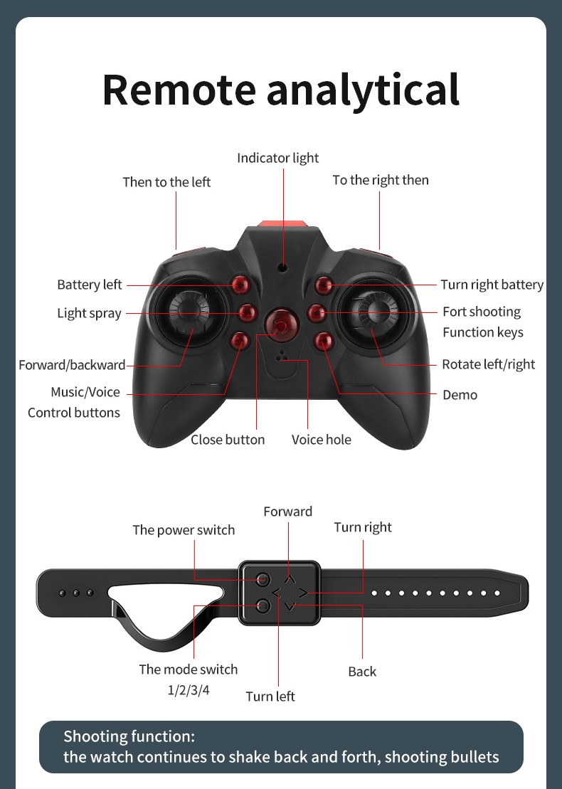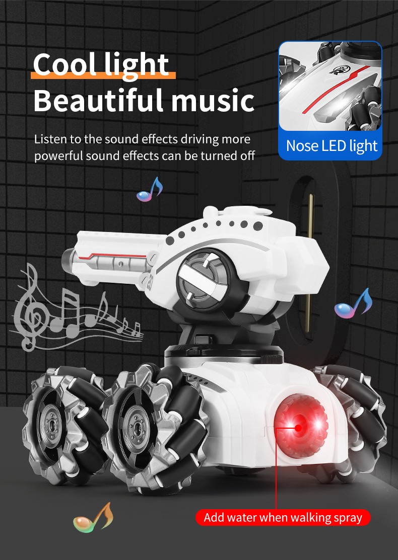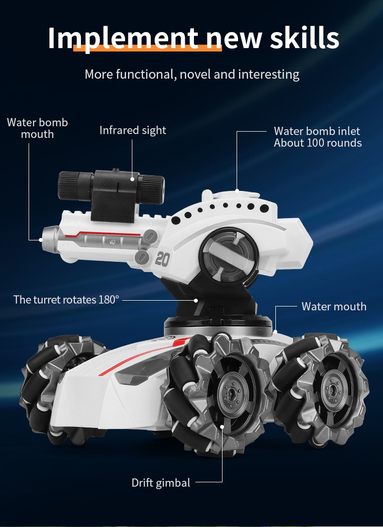 Bu ürün benzer ürünler tarafından müdahale edilmeyen 2.4G uzaktan kumanda teknolojisini benimser. Mekan tarafından kısıtlanmayan güçlü off-road tırmanma performansı. Yapısal kontrol simülasyonu, taret demonte edilebilir ve değiştirilebilir, esnek çalışma, çeşitli fonksiyonlar, hafif müzik, ileri ve geri, sola ve sağa dönün, 360 ° dönen