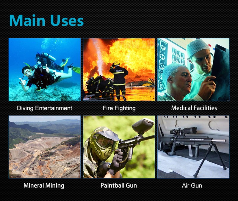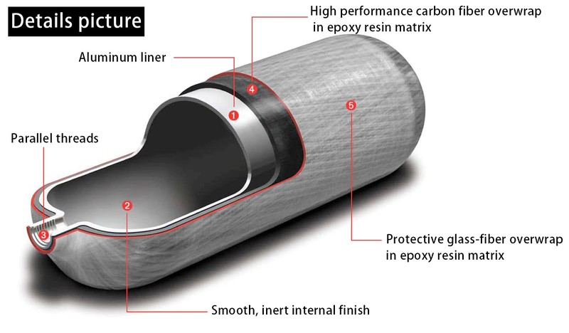 Bizim karbon fiber silindir iç yüksek kaliteli 6061 alüminyum alaşımlı malzeme yapılır, hangi dışında ithal karbon fiber ve koruma için cam reçine ile sarılır. Ürünler fabrikadan çıkmadan önce su basıncı, hava sızdırmazlığı, kumlama ve benzeri tarafından denetlenmiştir. Fabrikadan çıktığında her ürünün kalifiye olduğunu garanti ediyoruz.