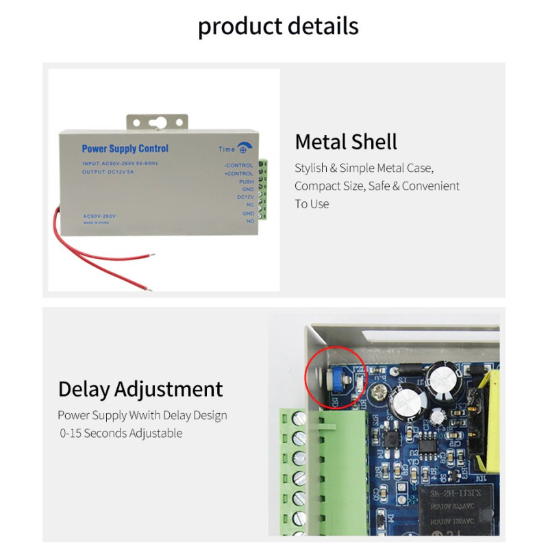 Bu bir 110V--260V (12V5A) erişim kontrol güç kaynağı, yüksek kaliteli elektronik bileşenler ve gelişmiş uluslararası teknoloji oluşur, anti-girişim yeteneği vardır, kilit kontrolü/kontrol kontrolü/çıkış düğmesi/RFID-IC okuyucu gibi çeşitli uygulamalarda çok kararlı ve güvenilir çıkış sağlar. Vb.