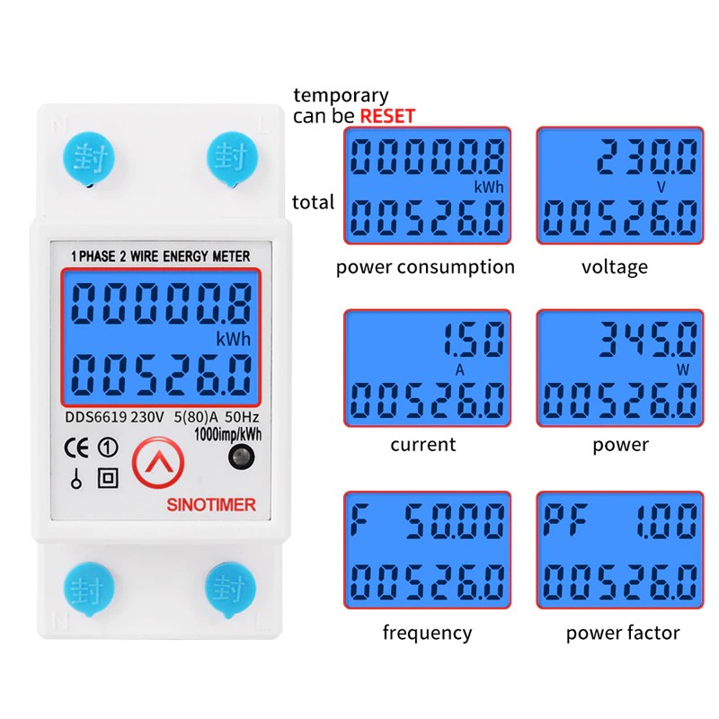 Metre çok fonksiyonlu ekran toplam enerji kWh, geçici enerji kWh, gerçek voltaj, gerçek akım, manuel presleme ile gerçek güç.