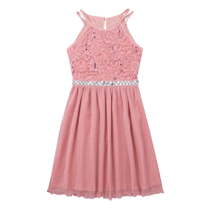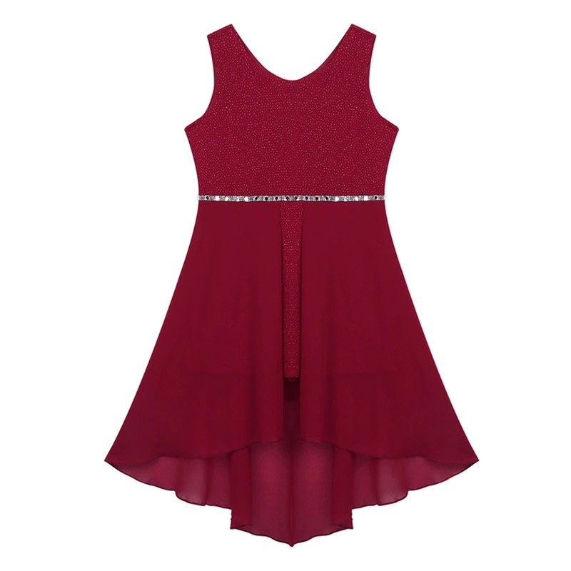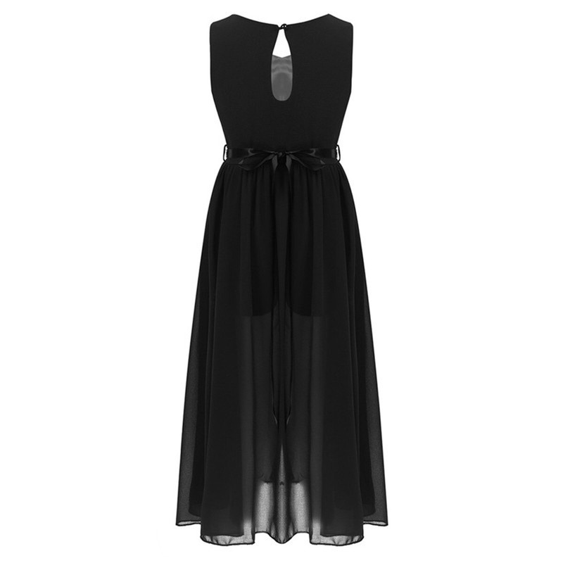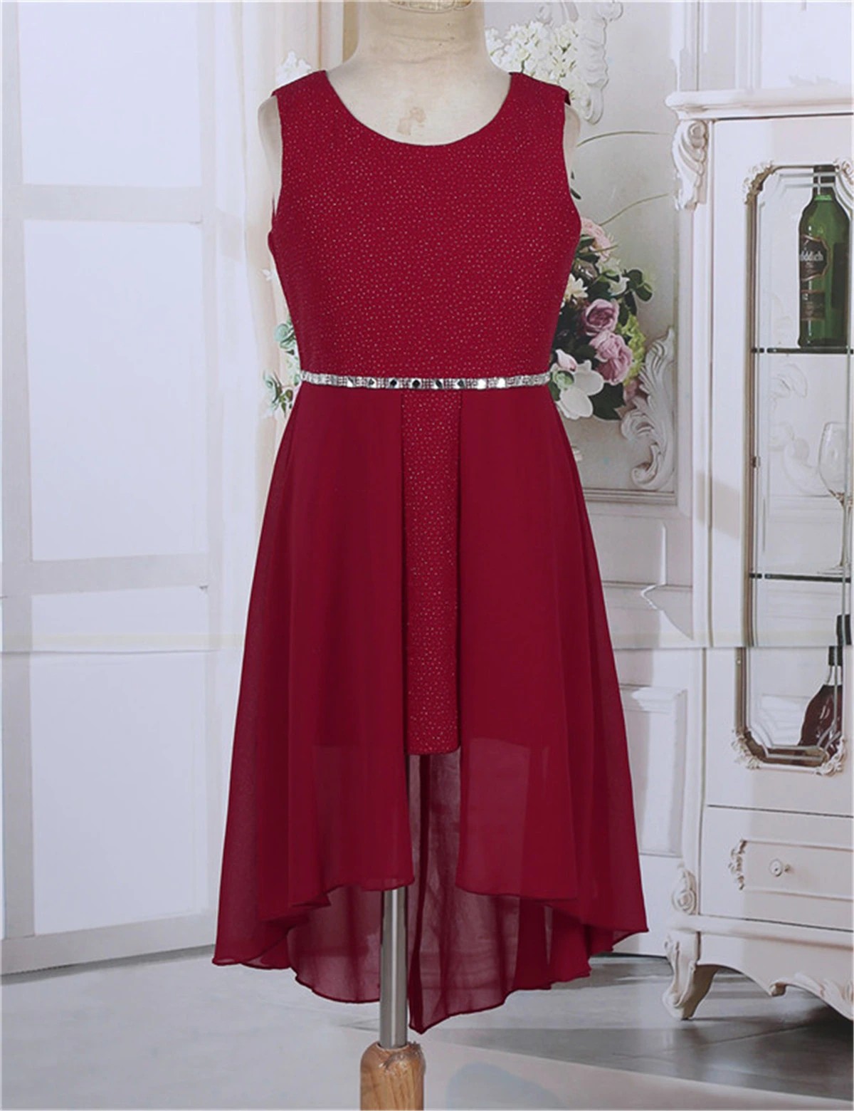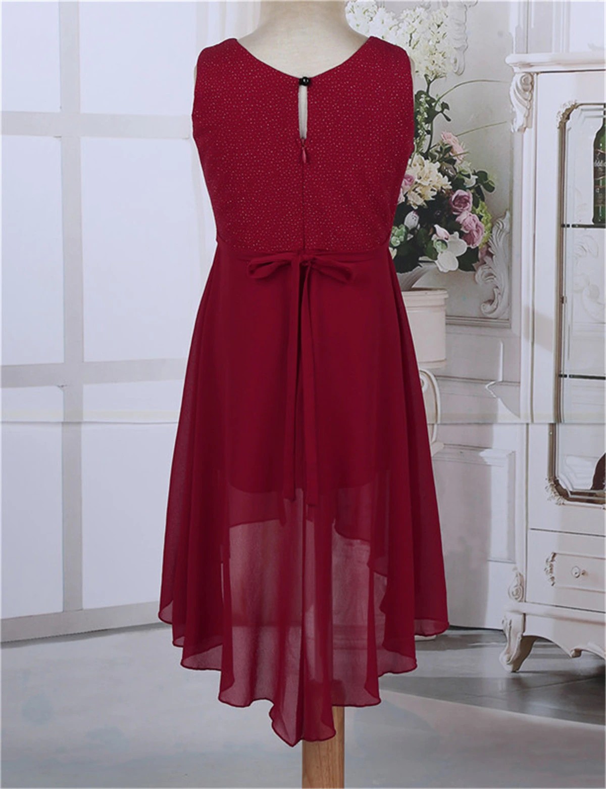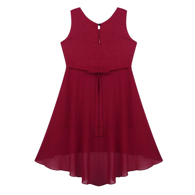 Gizli merkez arka fermuar kapatma. Bel etrafında bağlı 1 katmanlı yüksek düşük hem şifon kaplama. Kızın için ışıltılı elbise.