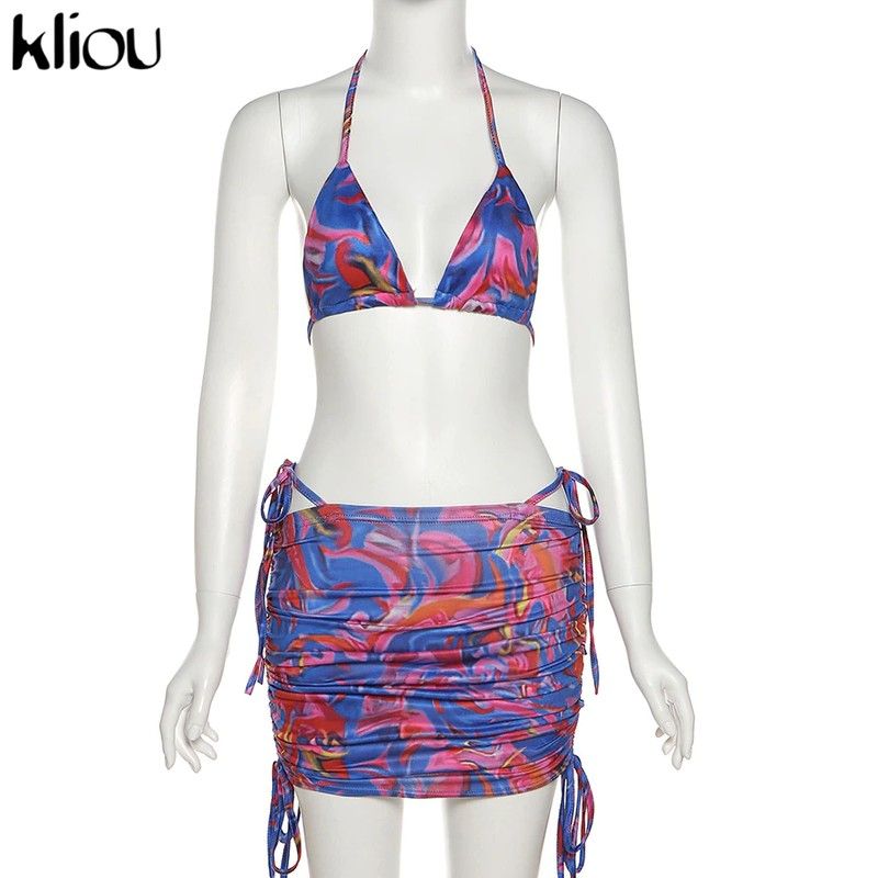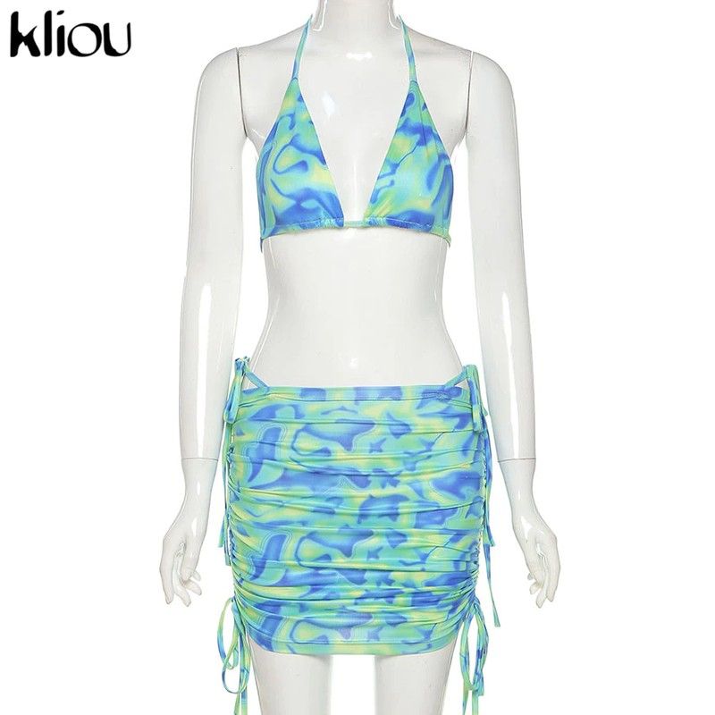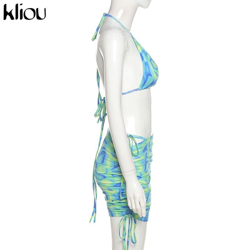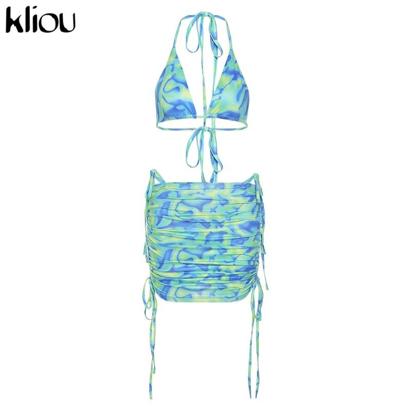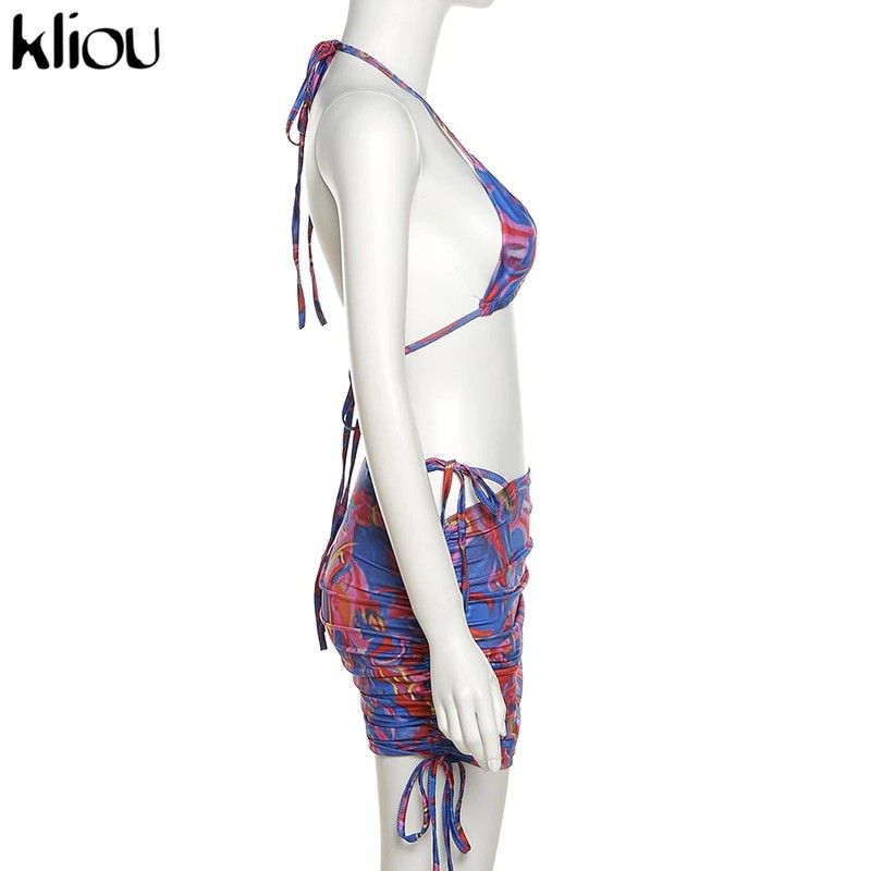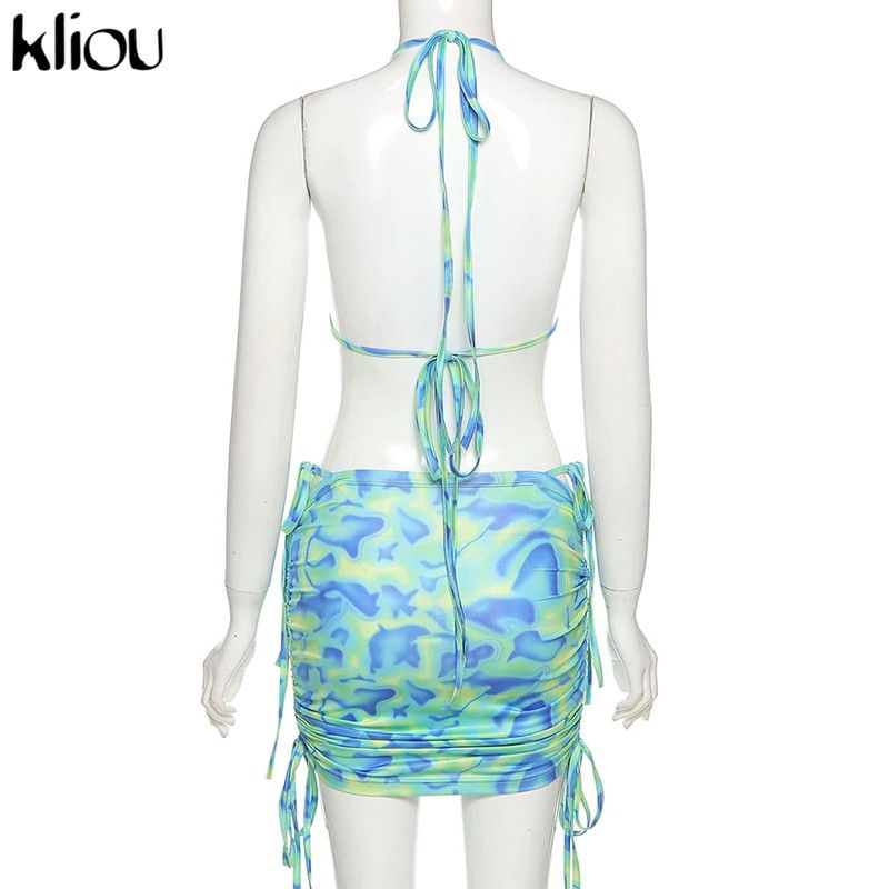 Kliou Bandaj Halter Baskı Iki Parçalı Set Kadınlar Backless Seksi Sıcak Üstleri + İpli Dantelli Etek Yaz Tatili Kıyafet Yok Külot