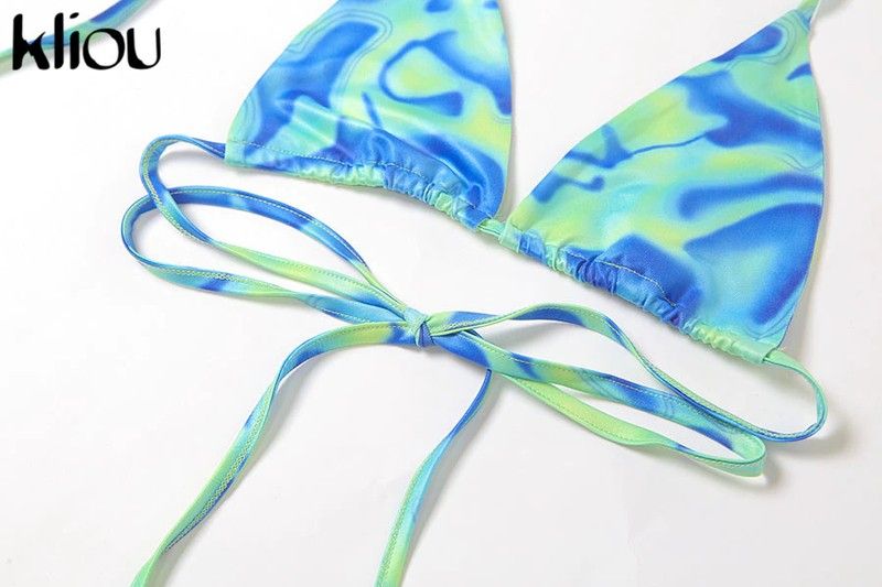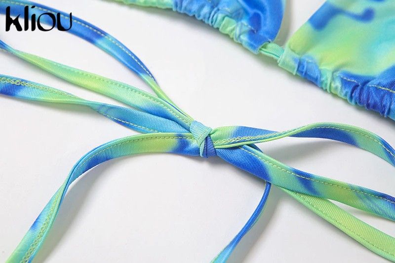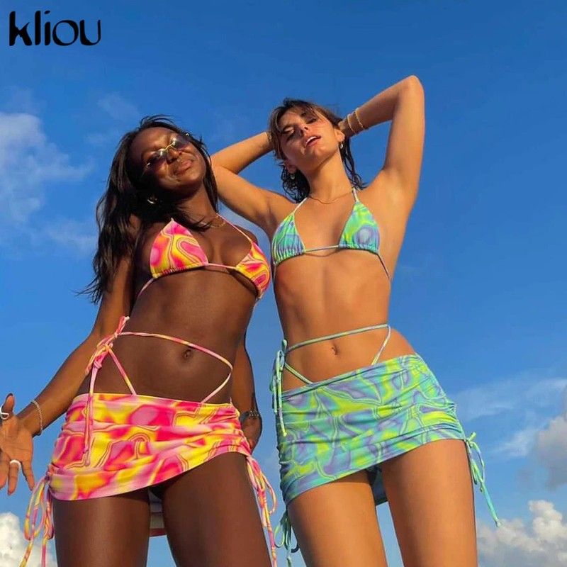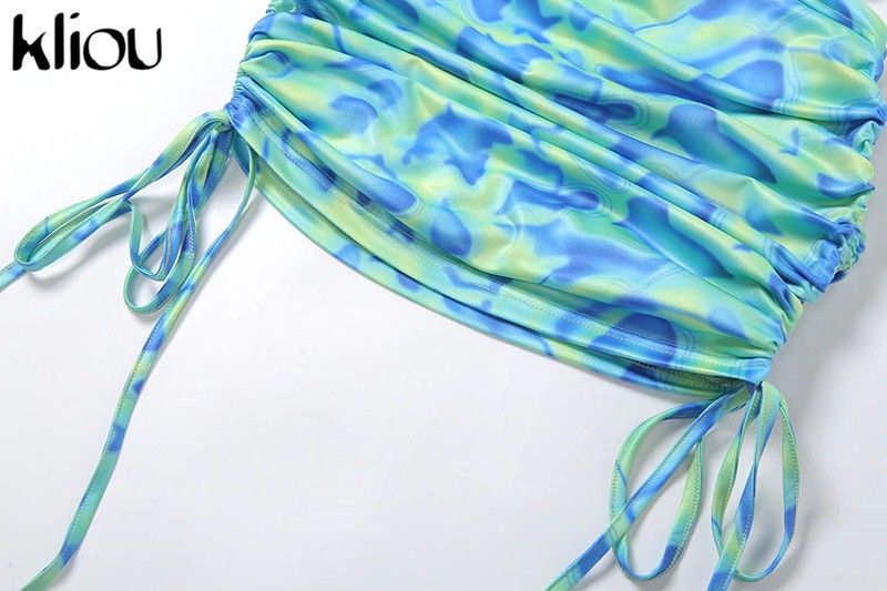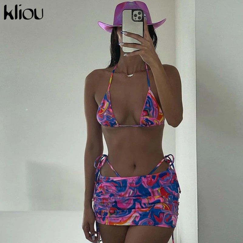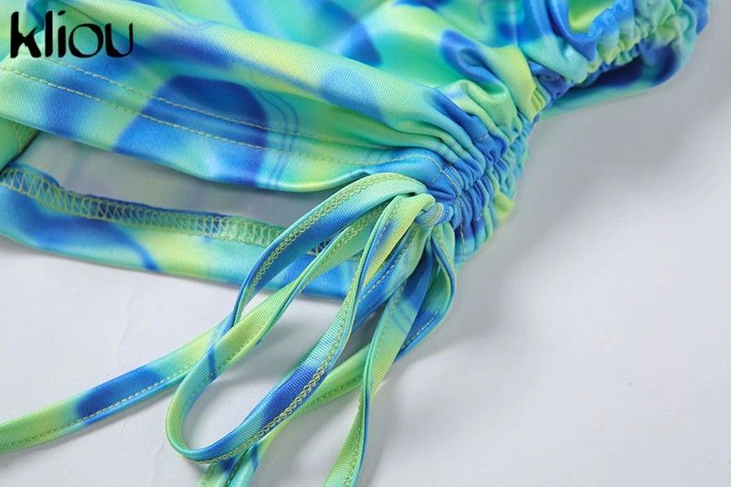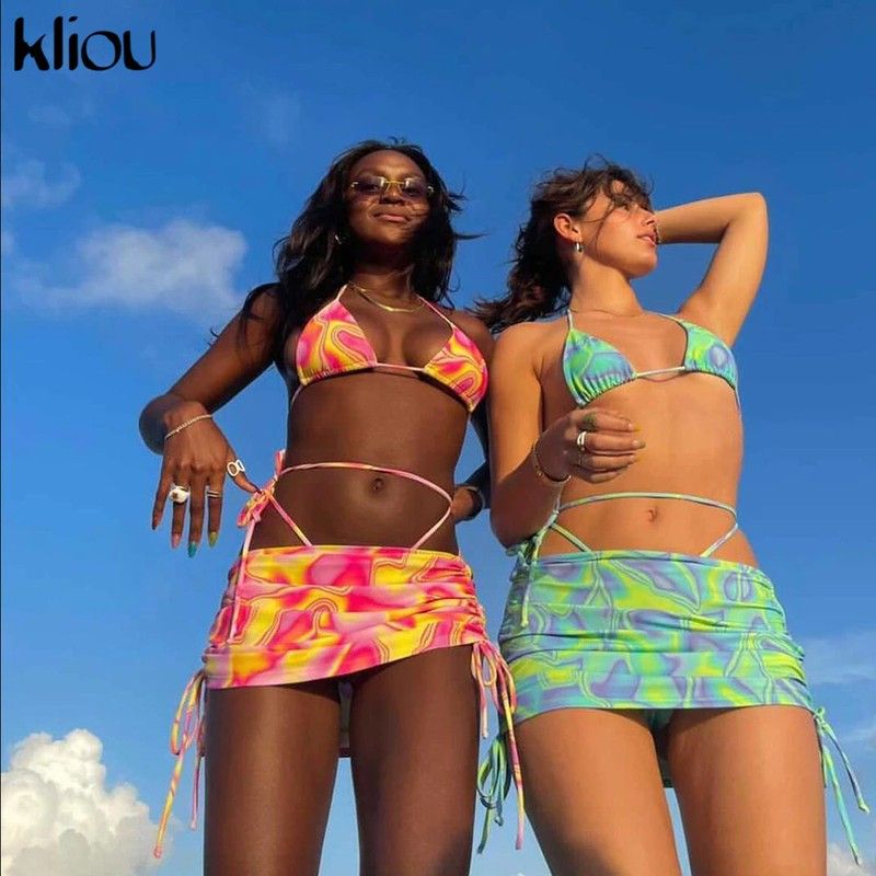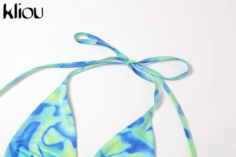 Kliou Bandaj Halter Baskı Iki Parçalı Set Kadınlar Backless Seksi Sıcak Üstleri + İpli Dantelli Etek Yaz Tatili Kıyafet Yok Külot