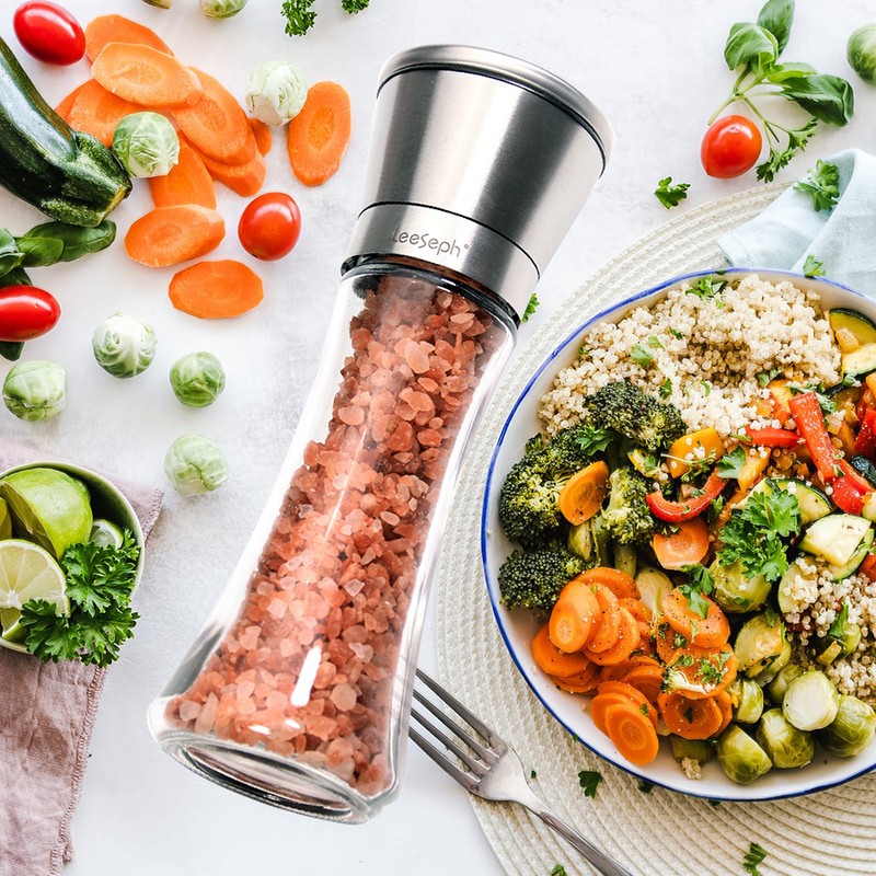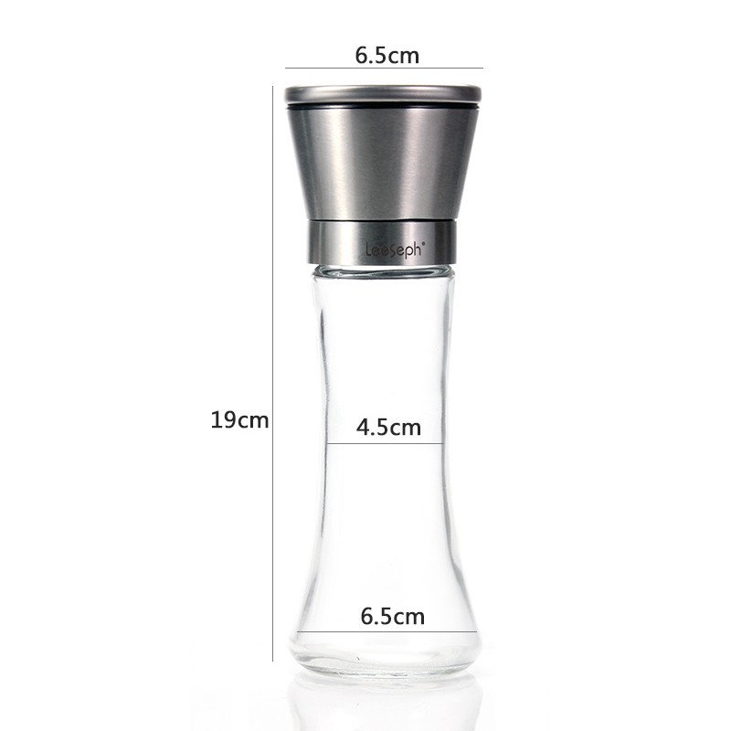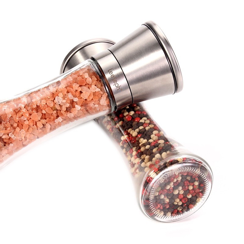 PERFECT FOR ALL TYPES OF SALTS AND PEPPERCORNS, providing you with fresh spices for all your meals! The high-quality adjustable ceramic rotor, with five grinding levels from coarse to fine, will help you grind your spices to perfection. MODERN and UNIQUE: Stainless Steel and Glass Salt and Pepper Grinder Set - Simple design with no logos or branding that will look elegant and smart on your table at all times and charm your family and guests. MAINTAIN the FRESHNESS of your favorite spices with these Leeseph salt and pepper mills glass grinders! They contain a sealing lid that fixes perfectly, keeping your ground spices freshly, away from moisture and dust, and free of undesirable residues on your table. THE GRINDERS MEASURE 7.5" tall by 2.5" wide and they have a 3/4 cup capacity to hold your peppercorn, sea salt, kosher salt, Himalayan salt, spices and more. These grinders do not come filled with spices. Fill it with the spice of your choice! FREE-REPLACEMENT GUARANTEE - Due to international transport, the product may be damaged and we can not completely avoid. Rest assured that if for any reason you are not absolutely satisfied with your product we will replace or refund your order, no questions asked. CONTACT US directly and we will take care of you.