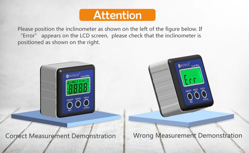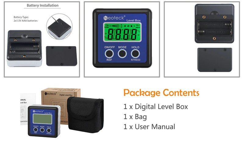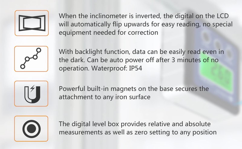Seviye kutusu, herhangi bir pozisyona sıfır ayarının yanı sıra göreceli ve mutlak ölçümler sağlar. Ekstra LCD okumak için uygundur. Küçük ve hafif, taşınması ve kullanılması gerçekten kolaydır. Ölçüm düzlemi, ölçülecek yüzeye eklenebilen disk mıknatısı içerir. Helikopter, gönye testere, otomobil testi ve onarım ve benzeri eğim açısını ölçmek özellikle kolaydır.