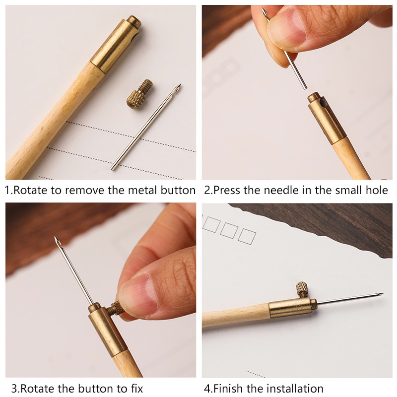 Iğne seti bir ahşap sap ve üç değiştirilebilir iğne kafasından oluşur.