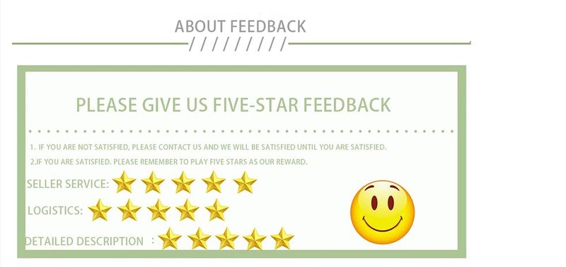 Görüşleriniz bizim için çok önemlidir. Bizimle mutlu iseniz, lütfen bize olumlu geribildirim (5 yıldız) bırakmayı unutmayın. Herhangi bir memnuniyetsizliğiniz varsa, lütfen bize olumsuz bir geri bildirim bırakmadan önce sorunu çözme fırsatı verin. Memnuniyetiniz hedefimizi takip ediyor.