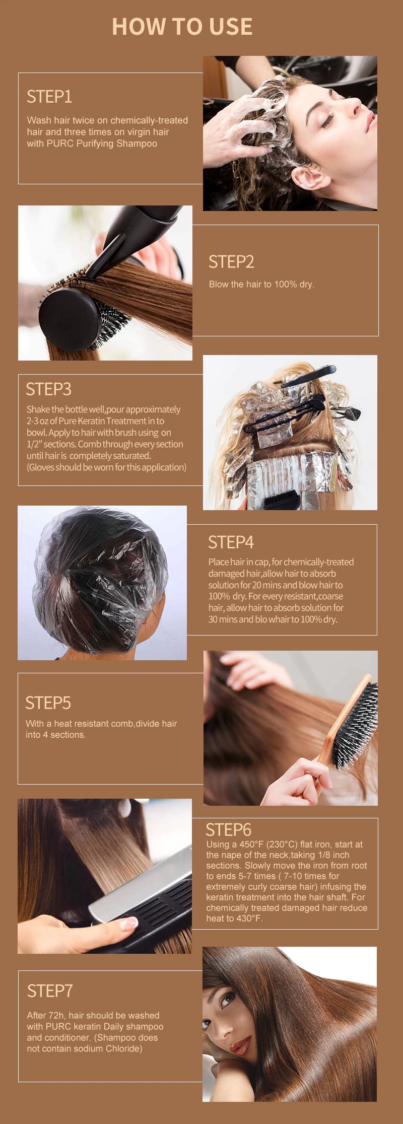1. Kimyasal olarak işlenmiş saçlarda iki kez yıkayın ve PURC arındırıcı şampuan ile bakire saçlarda üçüncü. Saçları % 100% kurumaya üfleyin. 2. Saç tamamen doymuş olana kadar her bölümü tarayın. Şişeyi iyice çalkalayın ve yaklaşık 2-3 oz Keratin tedavisi kase içine dökün. Eldiven giyin ve fırça ile saça uygulayın. 3. Saçları kapağa yerleştirin. Kimyasal olarak işlenmiş veya hasarlı saçlar için saçın 20 dakika boyunca çözeltiyi emmesine izin verin; Çok dayanıklı, kaba saçlar için saçın 30 dakika boyunca çözeltiyi emmesine izin verin. Sonra saçları % 100% kurumaya üfleyin. 4. Saçları ısıya dayanıklı bir tarak ile 4 bölüme ayırın. 450 ° f (230 ° c) düzleştirici kullanarak, 1/8 inç bölümleri alarak boynunuzun ense başlayın. Saç miline keratin aşılamak için yavaş yavaş kökünden 5-7 kez (son derece kıvırcık kaba saçlar için 7-10 kez) uçlarına demir hareket ettirin. Kimyasal olarak işlenmiş hasarlı saçlar için daha düşük ısı 430 °(200 ° c). 5. 3 gün sonra, tedavi sonrası şampuan ve saç kremi PURC ile saç yıkayın. (veya diğer şampuan sodyum klchloride içermez). Uyarı: Pencereleri, kapıyı açın ve tedavi yaparken fanı açın. Gözlerle temastan kaçının, temas halinde ılık suyla yıkayın.