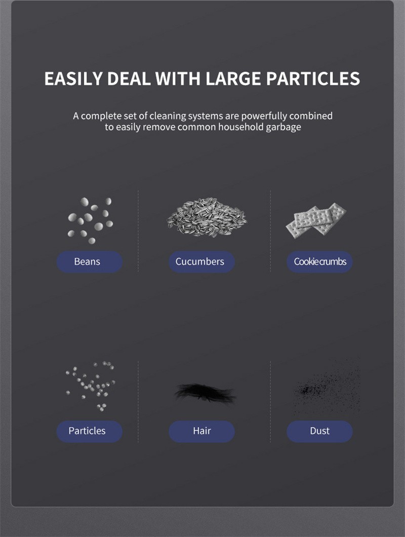 Ürün fonksiyonu: 1200 Pa bir emme kuvveti ile, kolayca toz, kağıt artıkları, saç, kavun tohumu kabukları ve diğer ortak çöp emebilir. Büyük paspas, suyu verimli bir şekilde emmek ve dekontamine etmek, bir seferde daha fazla alanı temizlemek için tasarlanmıştır.