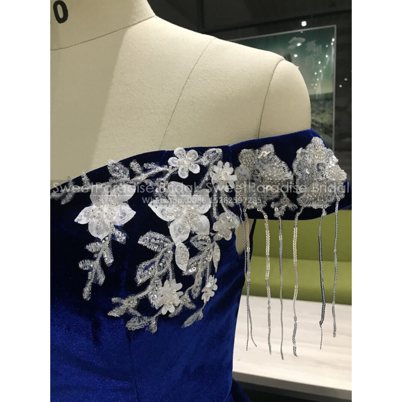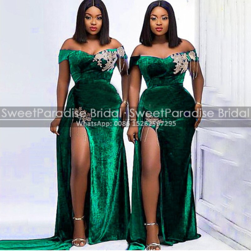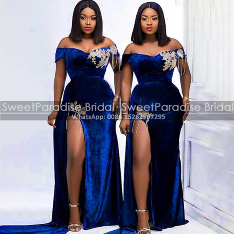 Kraliyet Mavisi Kadife Deniz Kızı Nedime Elbiseleri Aplike Yüksek Bölünmüş Artı Boyutu Kadınlar Için Açık Omuzlu Balo Elbisesi Düğün Partisi