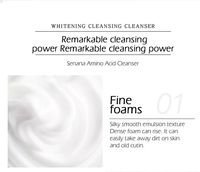 Senana Amino asit temizleyici 01 ince köpükler Ipeksi pürüzsüz emülsiyon dokusu yoğun köpük yükselebilir. Cilt ve eski kütin üzerinde kolayca kir alabilir. 02 sulu ve nemlendirici Cildi temizlerken, besleyici duygusunu koruyabilir. Temizledikten sonra, cilt hala sulu, yumuşak ve pürüzsüz tutar. 03 yıkandıktan sonra sıkı değil Amino asitin nem bileşenlerini içerir, kir ve artık yağları emer ve su ve yağ dengesini arttırır. Yüz cildi doğal, yumuşak, yumuşak ve pürüzsüz hale getirin. Gerçekten pürüzsüz.