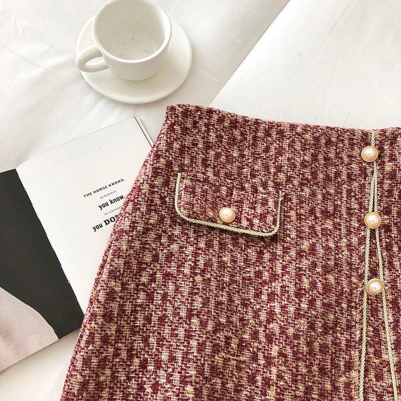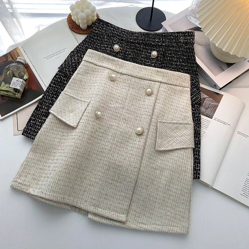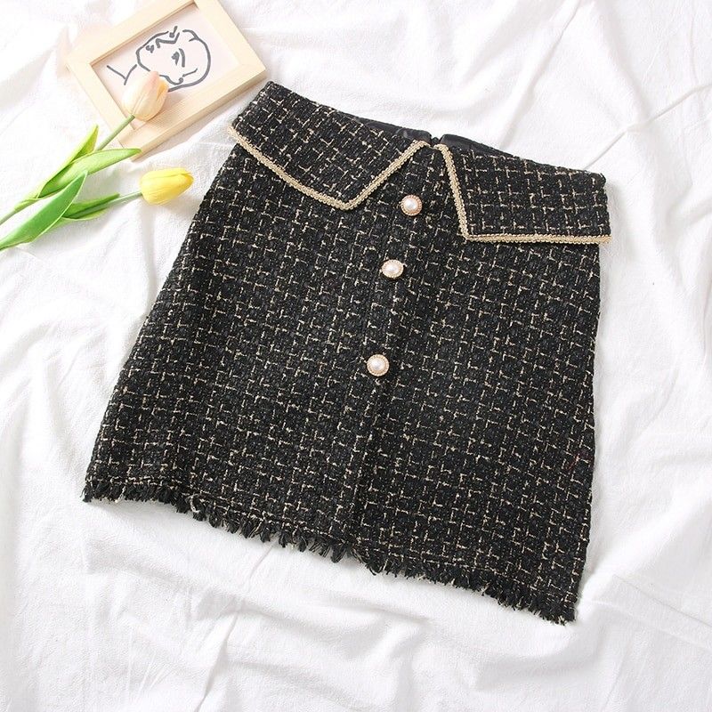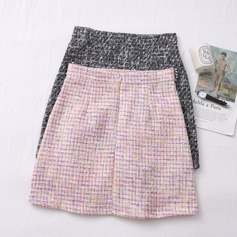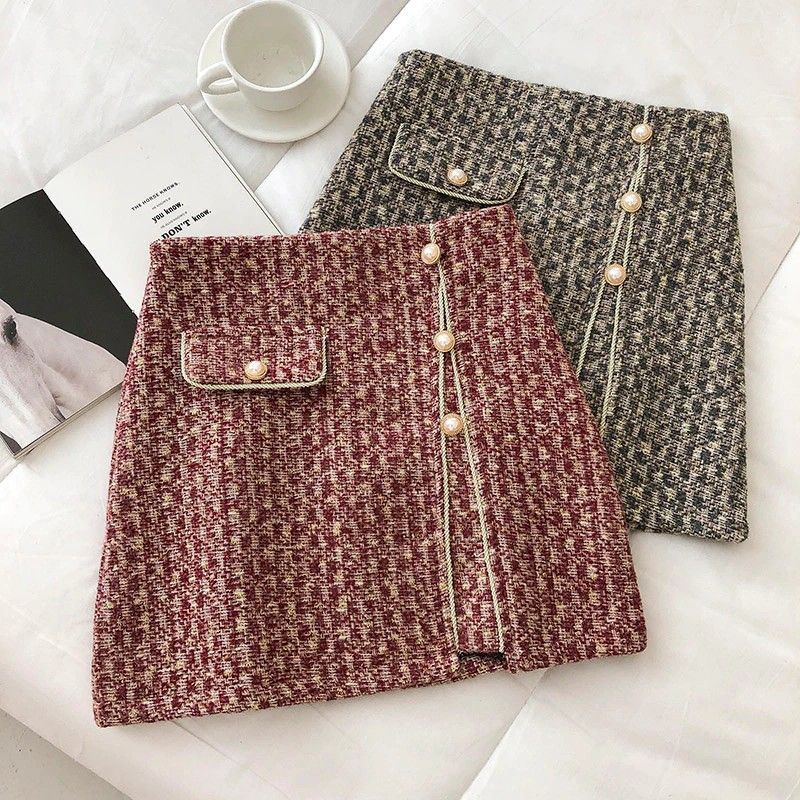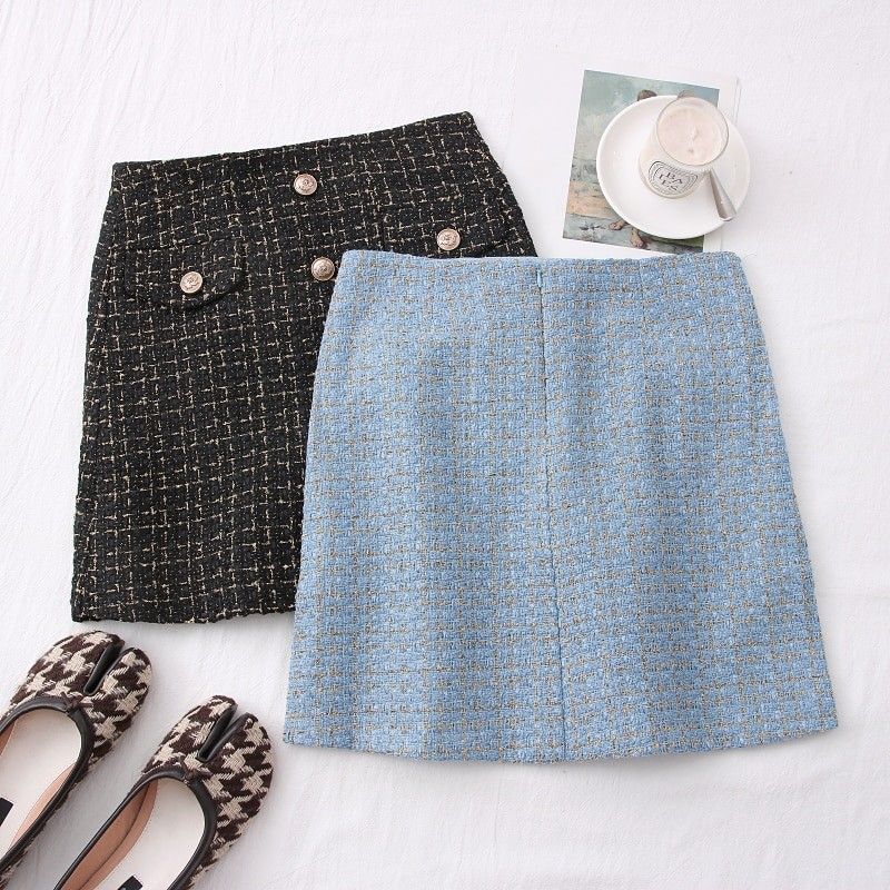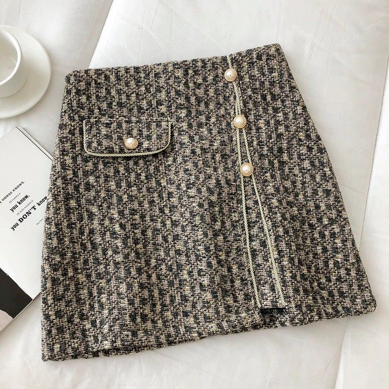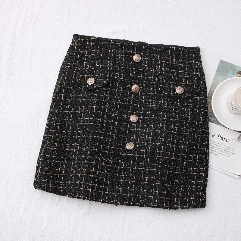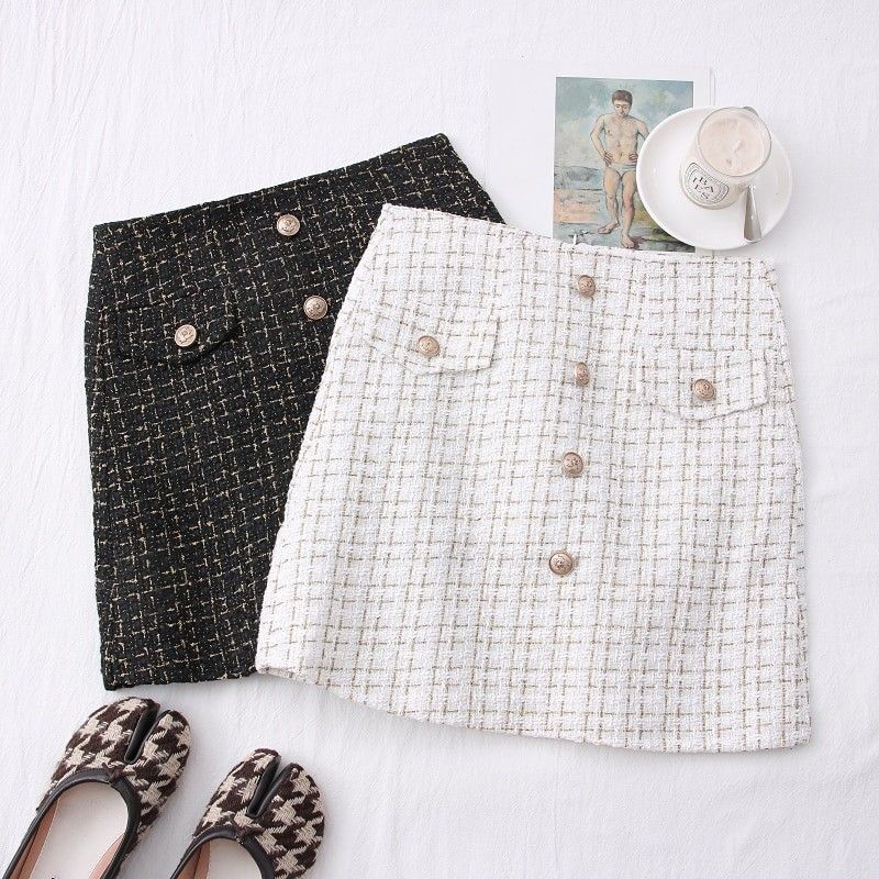 Tüvit Etek Kadınlar Için Katı Yüksek Bel Zayıflama Etekler Sonbahar Bahar en yeni Düğmeler Kruvaze Tüvit Yün Mini Etek