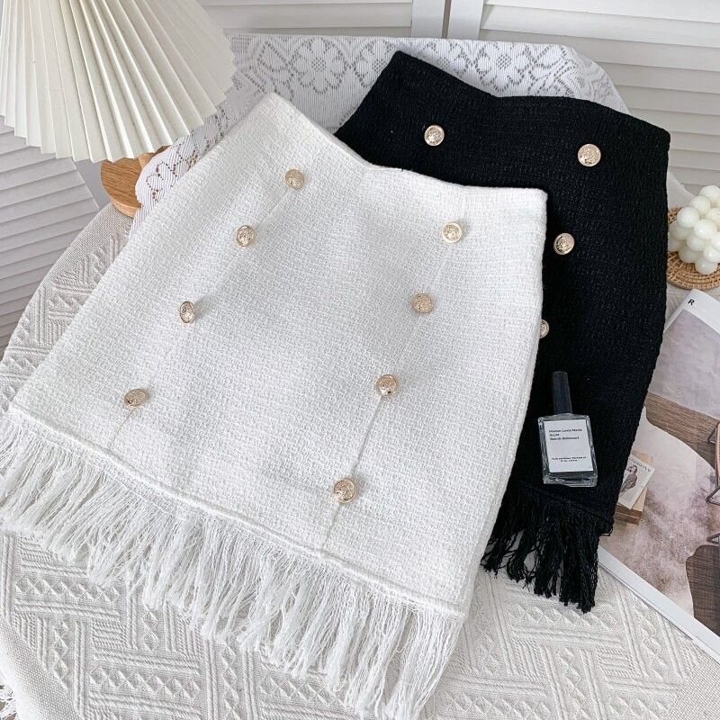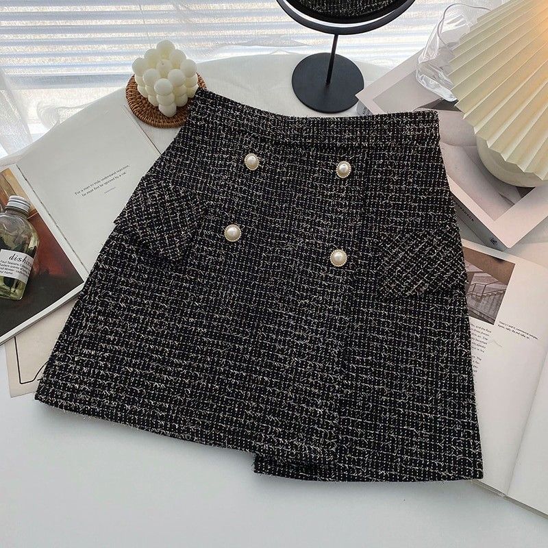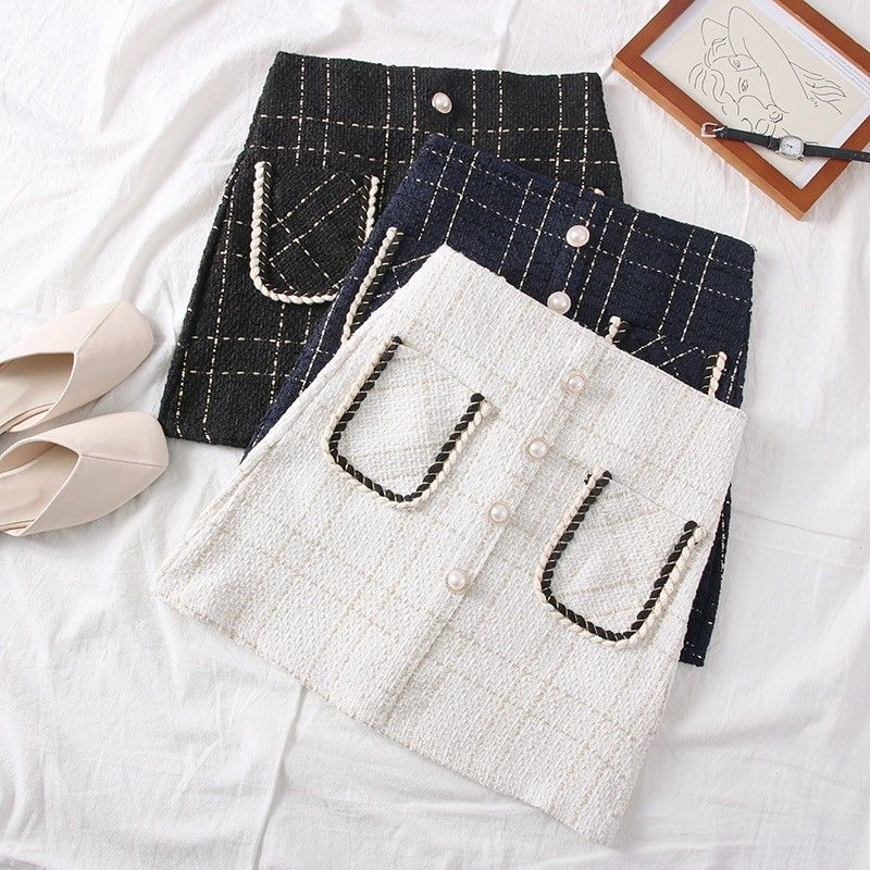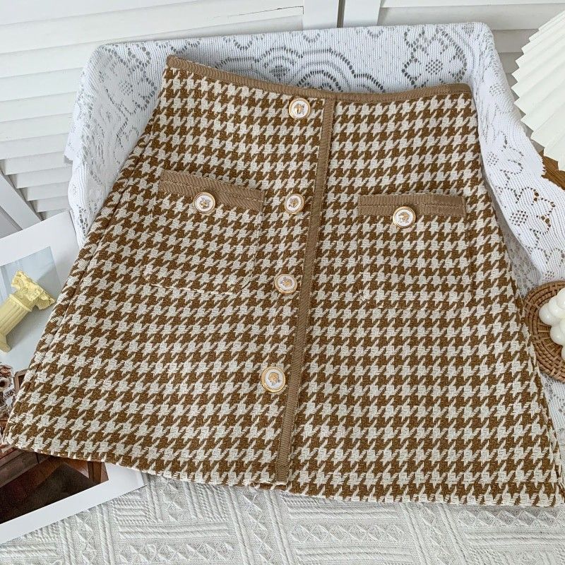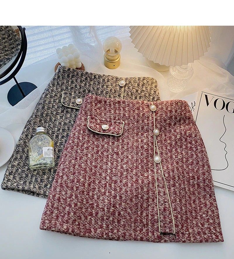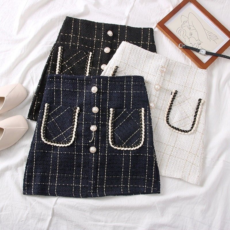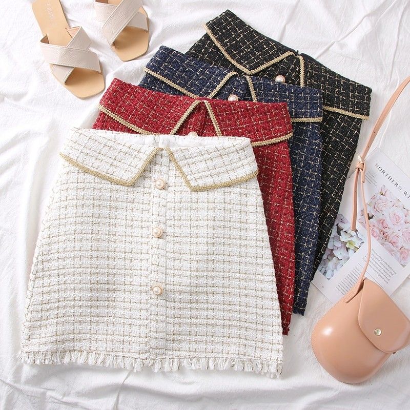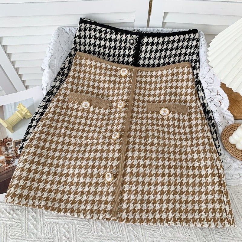 Tüvit Etek Kadınlar Için Katı Yüksek Bel Zayıflama Etekler Sonbahar Bahar en yeni Düğmeler Kruvaze Tüvit Yün Mini Etek