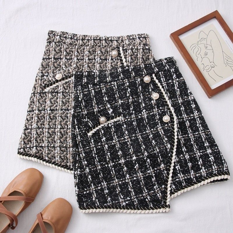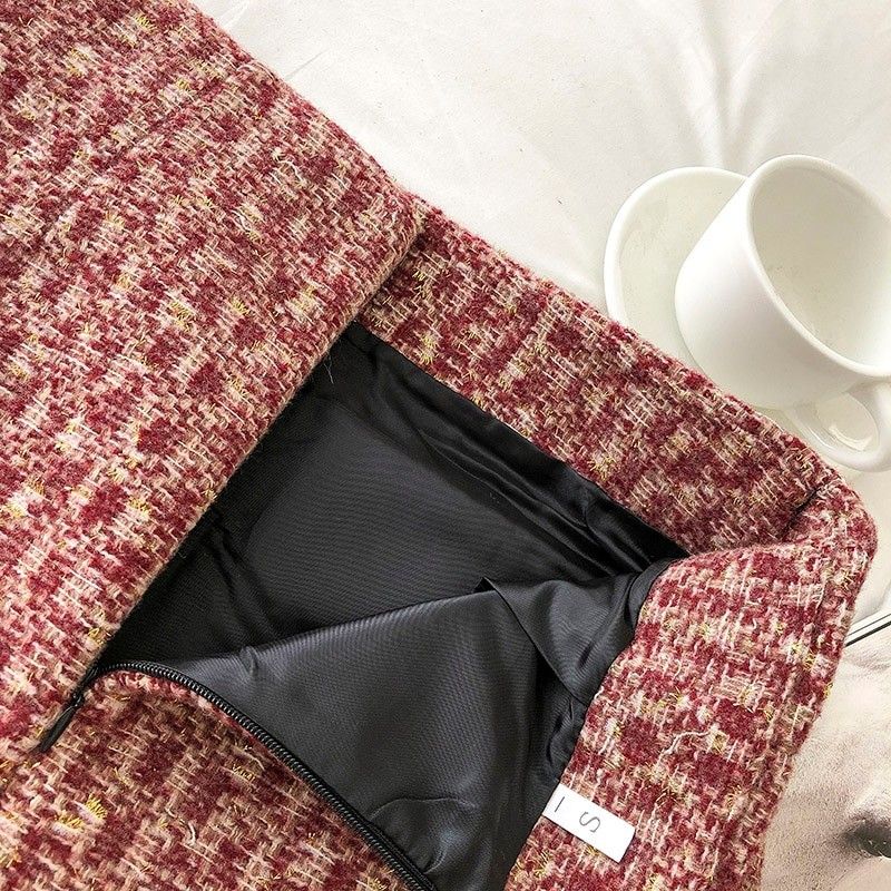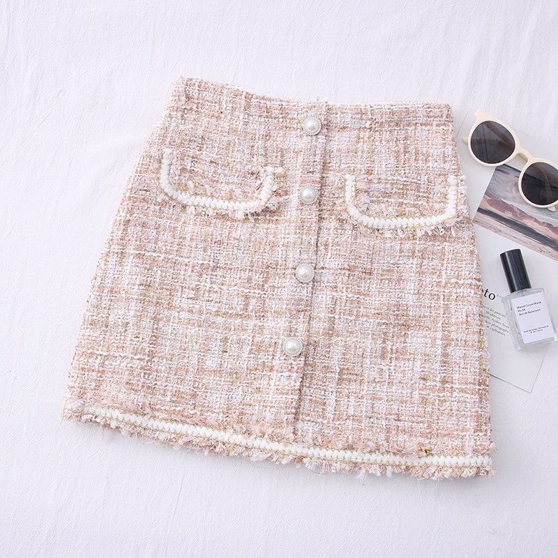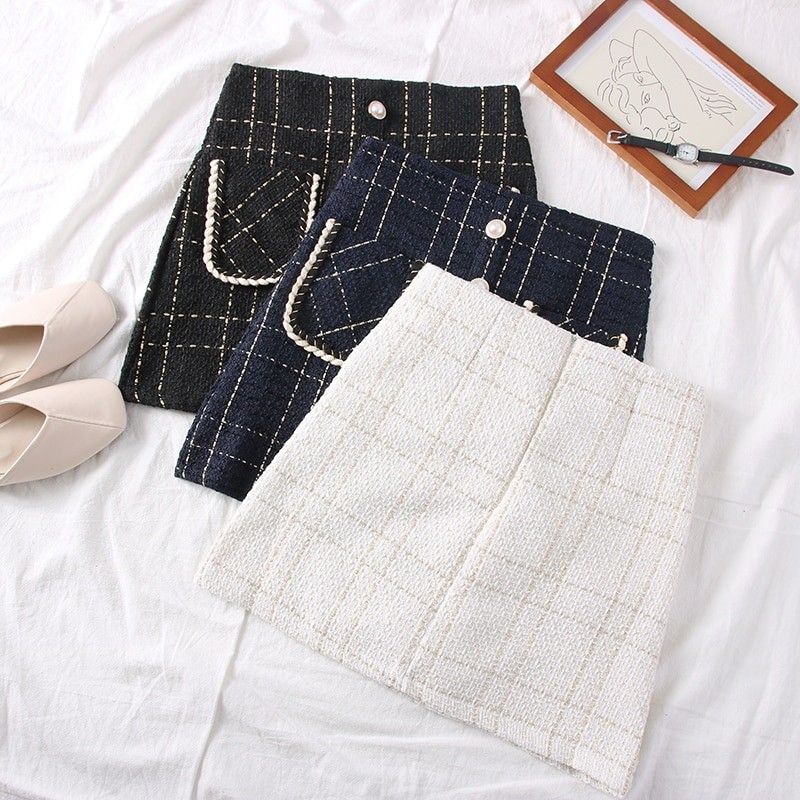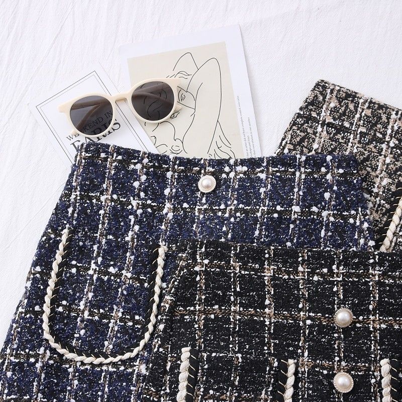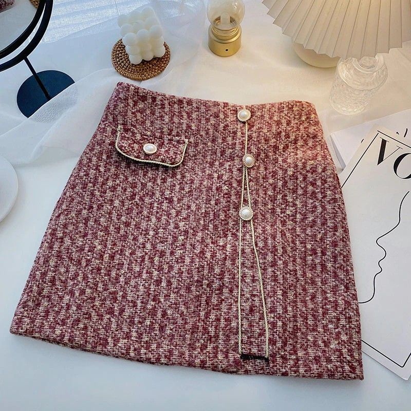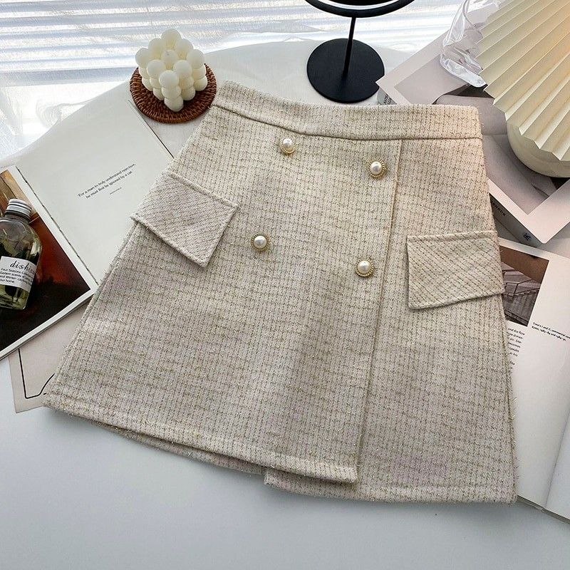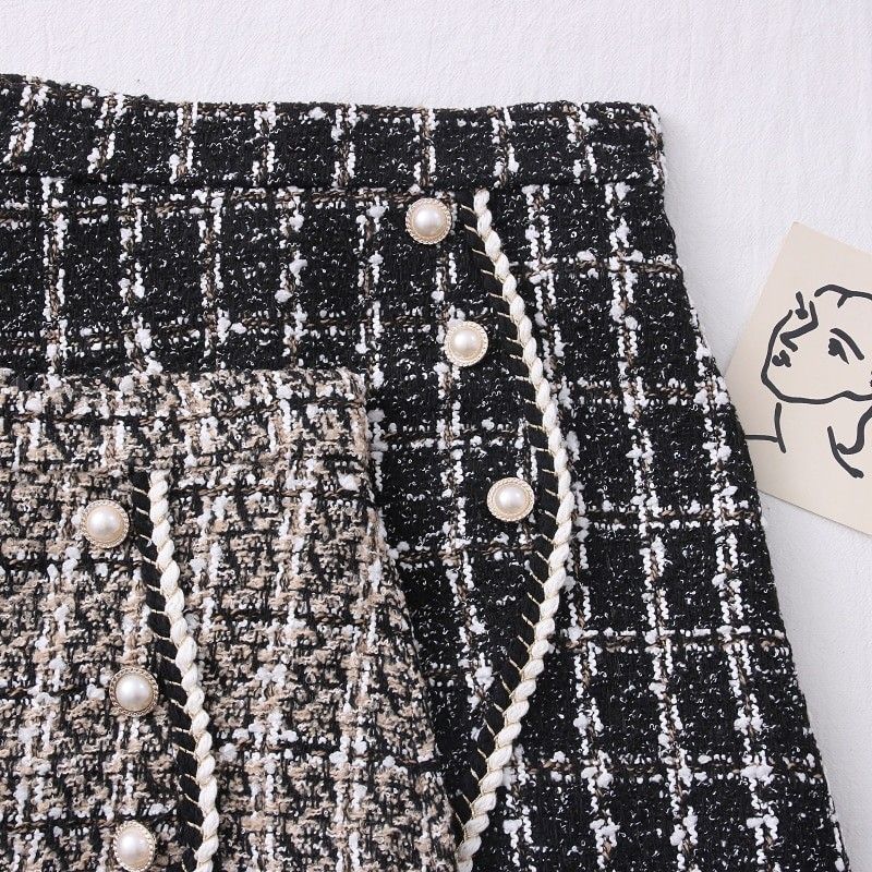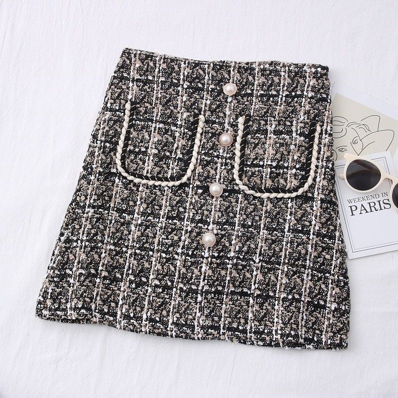 Tüvit Etek Kadınlar Için Katı Yüksek Bel Zayıflama Etekler Sonbahar Bahar en yeni Düğmeler Kruvaze Tüvit Yün Mini Etek