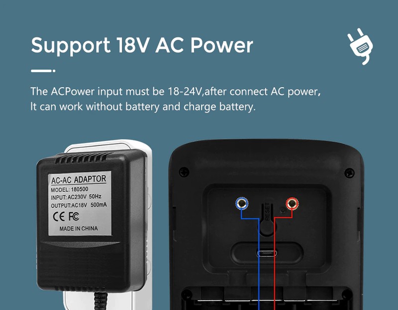 AC güç girişi 18-24V olmalıdır, AC güç bağladıktan sonra, pil olmadan çalışabilir ve pili şarj edebilir.