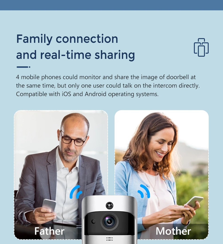 4 cep telefonu, kapı zili görüntüsünü aynı anda izleyebilir ve paylaşabilir, ancak sadece bir kullanıcı doğrudan interkom üzerinde konuşabilir. IOS ve Android işletim sistemleri ile uyumlu