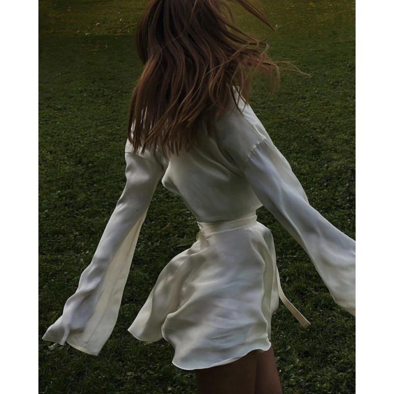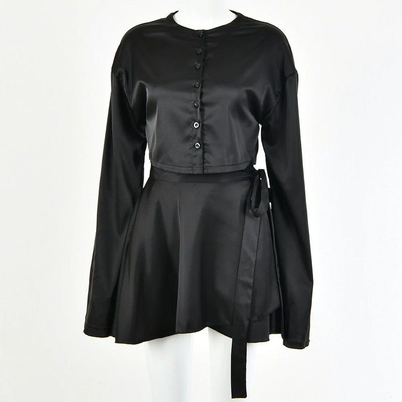 Beyaz Zarif Saten 2 Iki Parçalı Set Kadınlar Fener Uzun Kollu Kırpma Üstleri Hırka Seksi Yüksek Bel Mini Tenis Spor Etekler en yeni