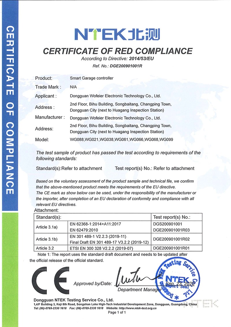 WG-088 akıllı garaj denetleyicisi CE, sertifika No DGE200901001R01, Test raporuna ihtiyacınız varsa, uygunluk beyannameleri