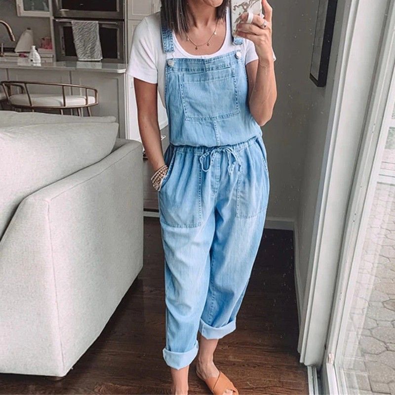 Kadınlar Mavi Denim Tulum Tulum Tulum Kuşaklı Delik Içi Boş Dışarı Cep Kadın Rahat Moda Kadın Pantolon En sonuncu Yeni # T4G