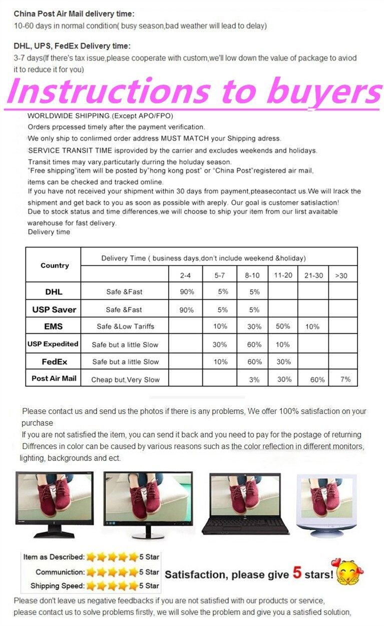 Remarque 3: nous avons envoyé les chaussures en fonction de la taille européenne, si vous trouvez qu'il y a des pays taille de chaussures, utilisez simplement le tableau des tailles européennes pour vérifier les chaussures que vous avez reçues, la taille des autres pays peut être ignorée