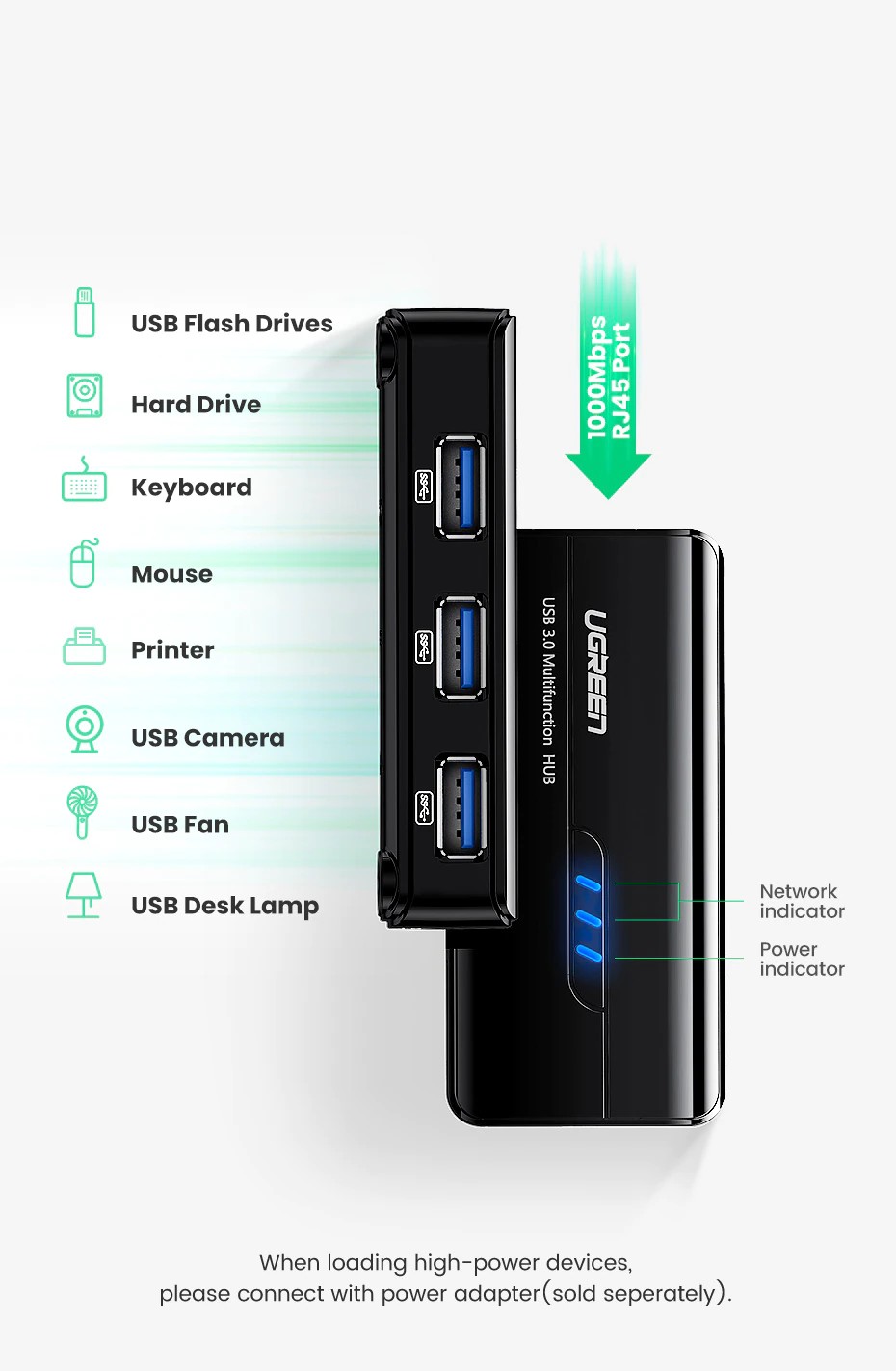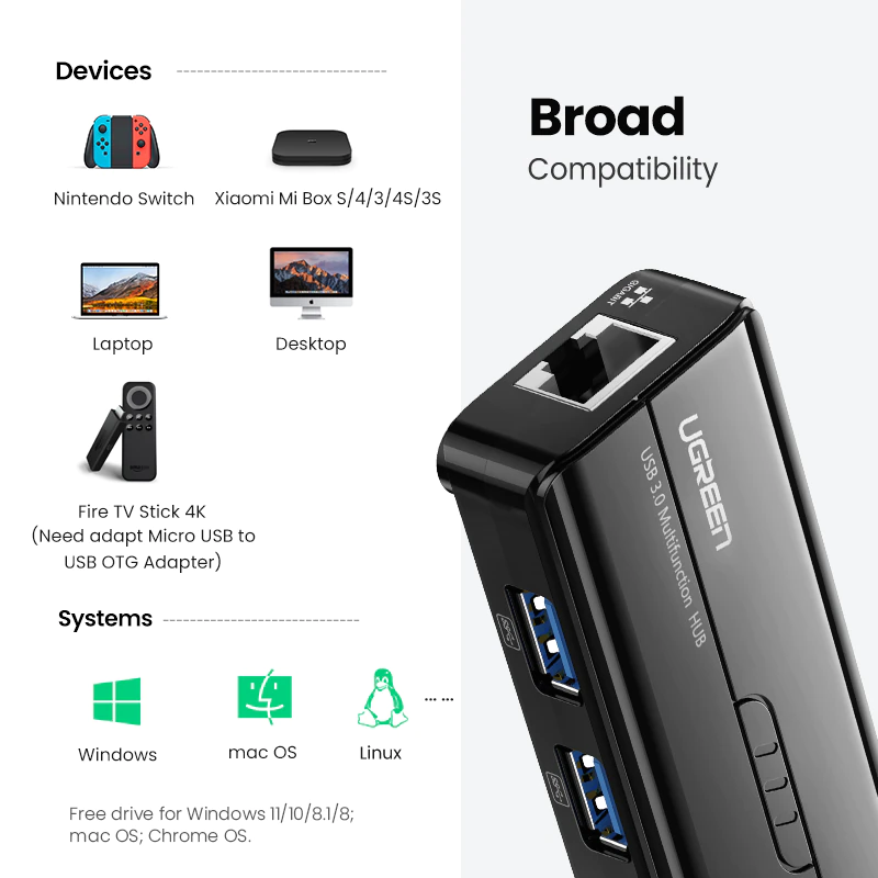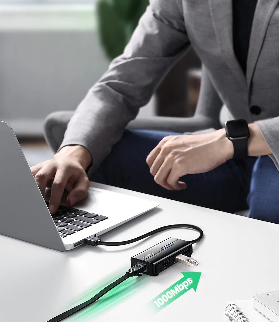 UGREEN USB Ethernet Adapter Network Card USB HUB with full 1000/100/10 Mbps RJ45 port and 3*USB 3.0 ports.