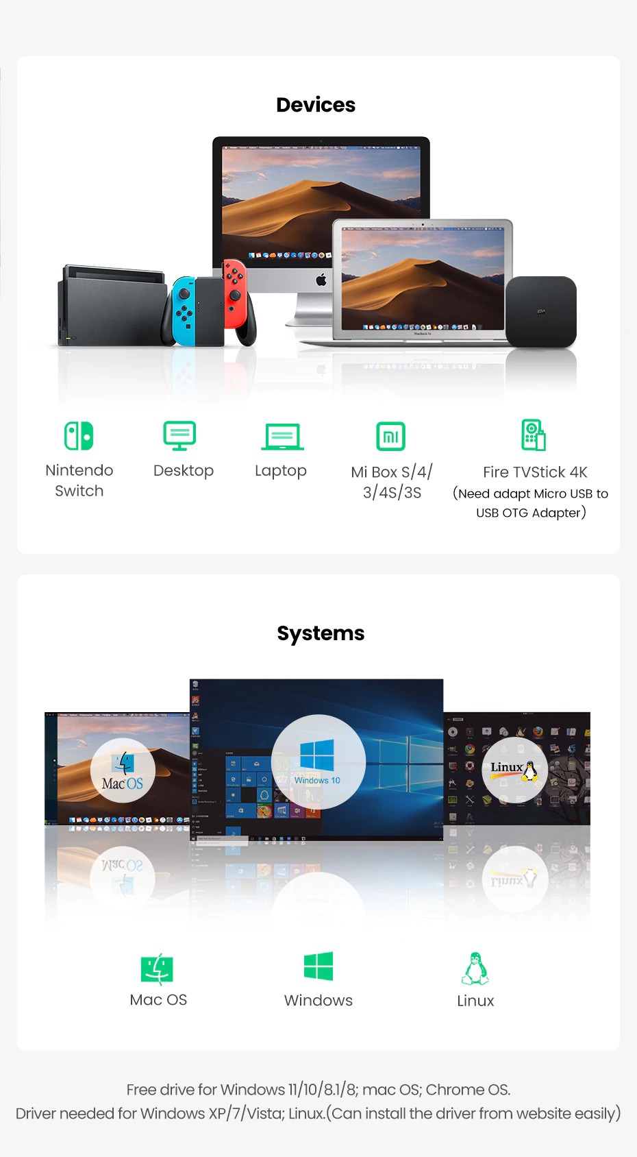 1) Suitable for your Laptop, Desktop, Xiaomi Mi Box S/4/3/4S/3S, Nintendo Switch, and so on;