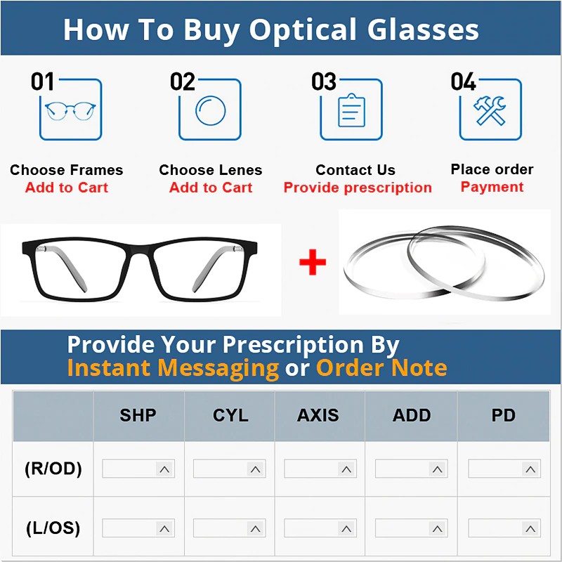 If you need prescription glasses, please follow the picture below, add the frame and lenses to the shopping cart and order and leave your prescription to me. We will make the glasses for you according to your prescription. If you don’t know how to choose lenses, please Contact our clerk, she will tell you how to buy prescription glasses correctly