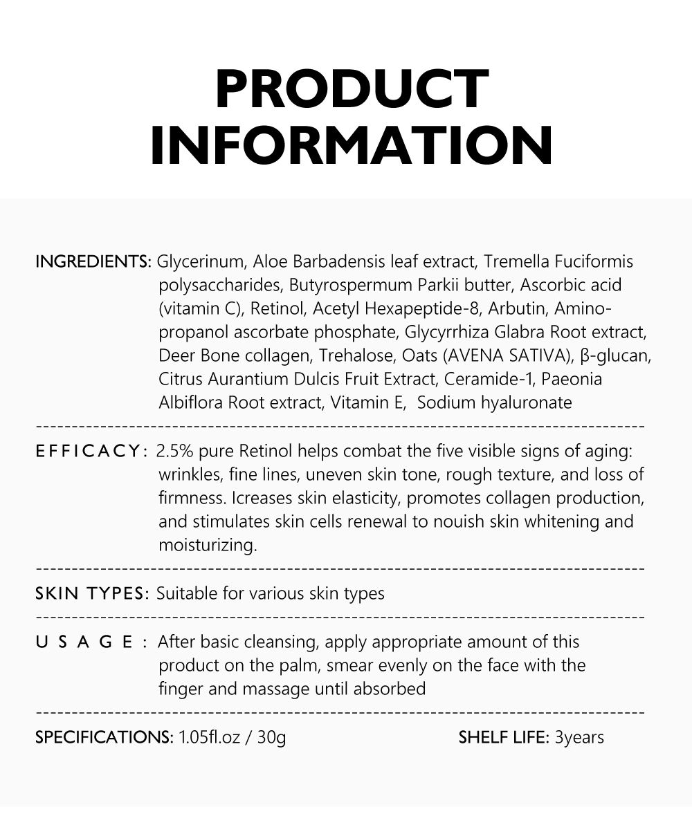 6.[Effect]: 2.5% pure Retinol helps combat the five visible signs of aging:wrinkles, fine lines, uneven skin tone, rough texture, and loss of firmness. Icreases skin elasticity, promotes collagen production, and stimulates skin cells renewal to nouish skin whitening and moisturizing.