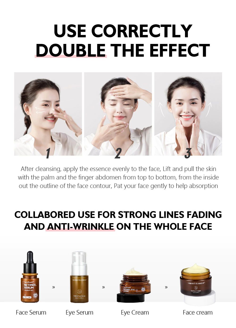 After cleansing,apply the essence evenly to the face, Lift and pull the skin with the palm and the finger abdomen from top to bottom,from the inside out the outline of the face contour, Pat your face gently to help absorption